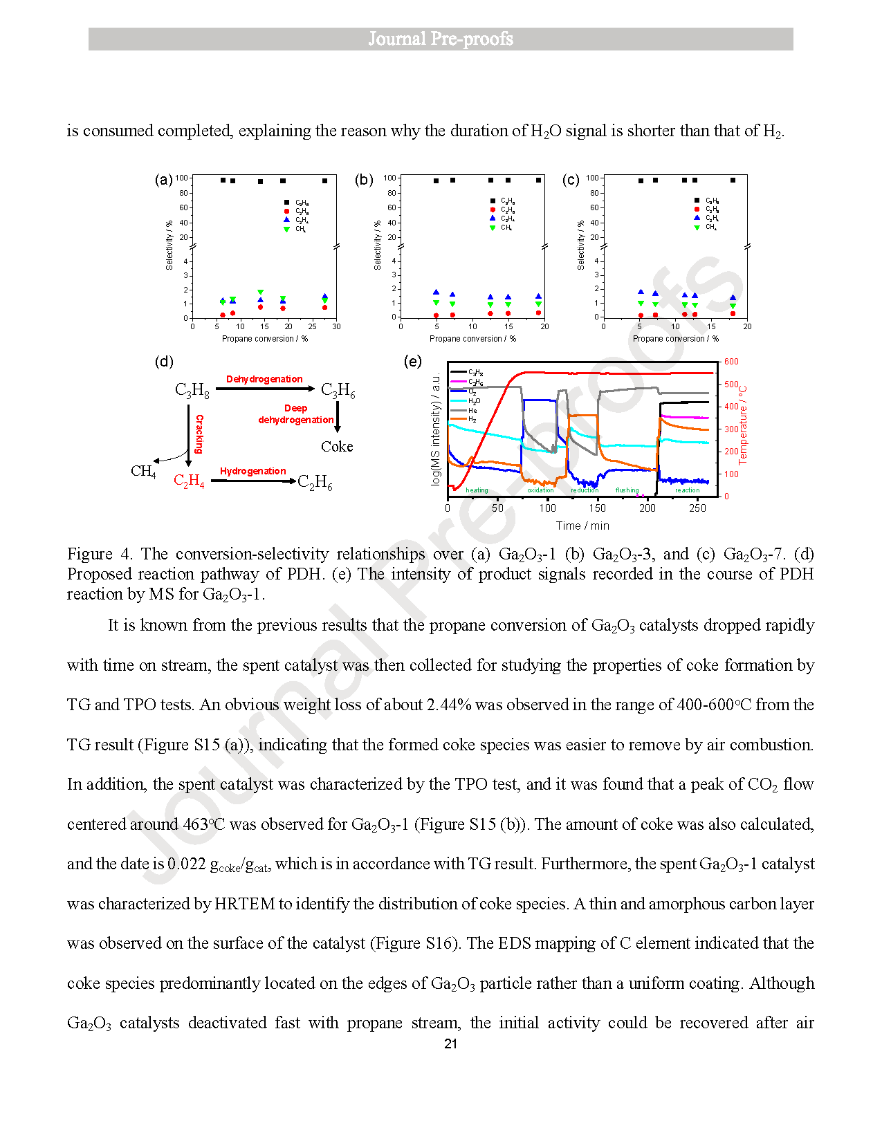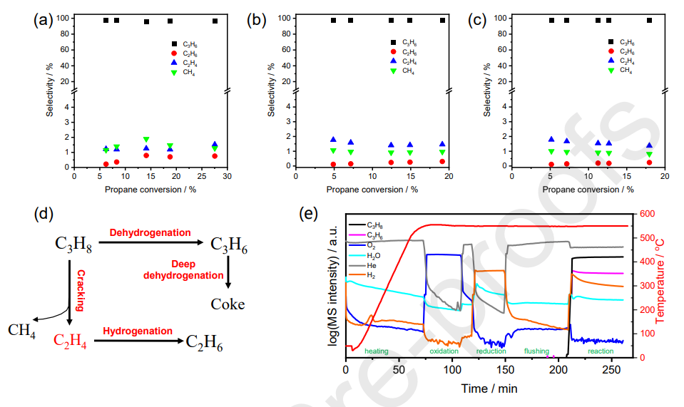 图 4.(a–c) Ga2O3-1、Ga2O3-3 和 Ga2O3-7 的转化率与选择性关系;(d) PDH反应的拟议反应路径;(e) 在PDH反应过程中通过质谱(MS)记录的Ga2O3-1产物信号强度。