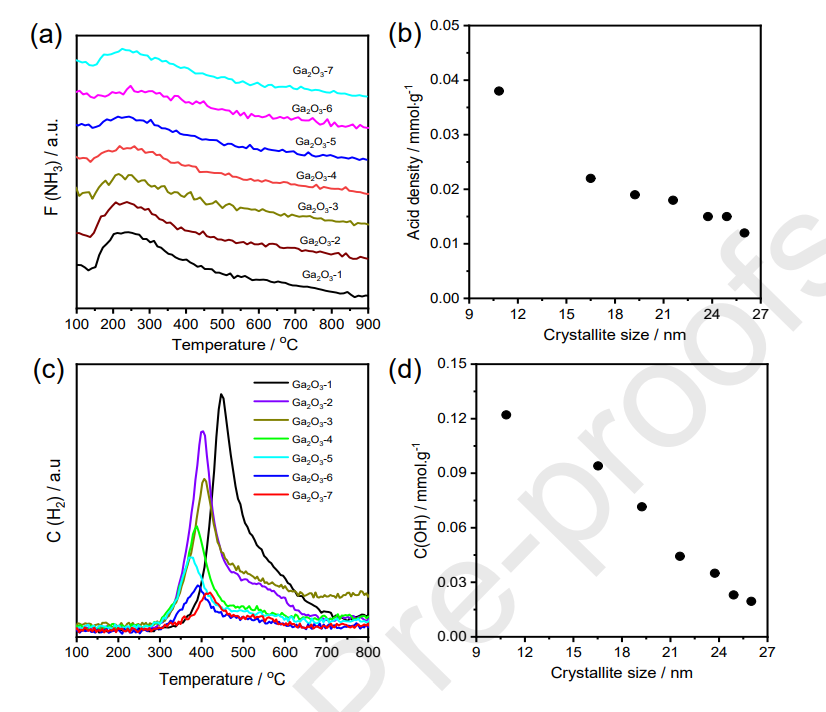图 2.(a) NH3-程序升温脱附(TPD)曲线;(b) 不同Ga2O3催化剂酸性位点密度与晶粒尺寸的关系;(c) CO-程序还原(CO-TPR)测试中释放的H2流量;(d) 不同Ga2O3催化剂表面羟基(OH)浓度与晶粒尺寸的关系。