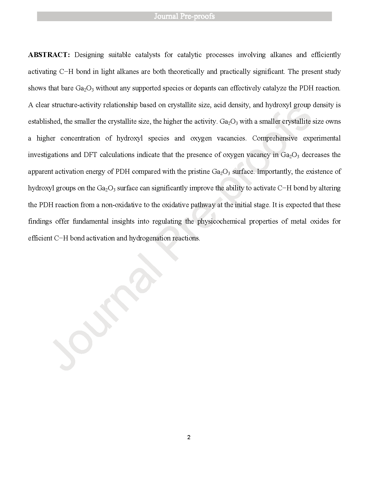 设计适用于烷烃催化转化过程的高效催化剂,以及实现轻烷烃中 C–H 键的高效活化,在理论研究和实际应用中均具有重要意义。本研究表明,在不引入任何负载组分或掺杂元素的情况下,本征 Ga2O3 也能够有效催化丙烷脱氢(PDH)反应。研究建立了基于晶粒尺寸、酸性位密度和羟基密度的清晰结构–活性关系,即晶粒尺寸越小,催化活性越高。晶粒尺寸较小的 Ga2O3 具有更高浓度的羟基物种和氧空位。综合实验表征与密度泛函理论(DFT)计算结果表明,与本征 Ga2O3 表面相比,氧空位的存在可显著降低 PDH 反应的表观活化能。更为重要的是,Ga2O3 表面羟基的存在能够在反应初始阶段将 PDH 的反应路径由非氧化途径转变为氧化途径,从而显著增强 C–H 键的活化能力。上述研究结果为通过调控金属氧化物的物理化学性质以实现高效 C–H 键活化及加氢/脱氢反应提供了重要的基础认识。