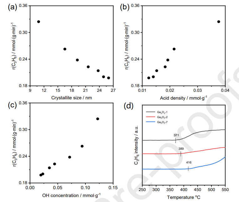 图 3.(a–c) 不同Ga2O3催化剂上丙烯生成速率 r(C3H6) 与晶粒尺寸、酸性位点密度和羟基浓度的关系;(d) 三种代表性Ga2O3催化剂在C3H8-程序升温表面反应(TPSR)测试中丙烯信号强度随温度的变化。反应温度:550°C,进料组成:40% C3H8/N2。