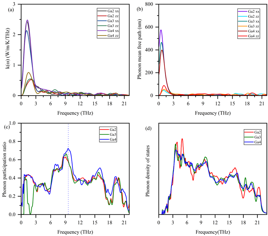 图7. (a) 谱热导率;(b) 声子平均自由程;(c) 声子参与比;(d) 声子态密度。