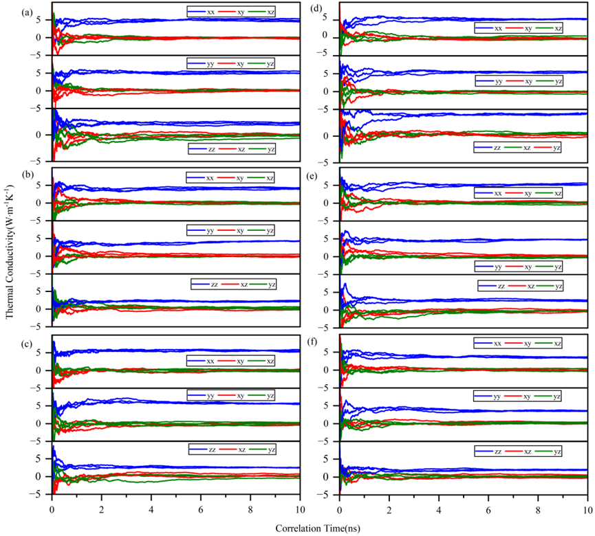 图 4. (a)-(c) 和 (d)-(f) 分别展示了 Ga2、Ga3、Ga4 以及 Ga21、Ga31、Ga41构型在 300 K 温度下沿 x、y、z 方向的晶格热导率。