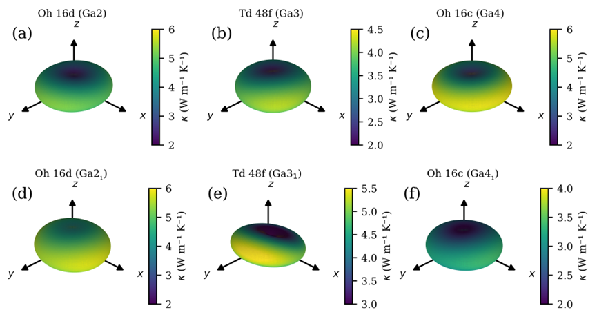 图5. (a) Ga2, (b) Ga3, (c) Ga4, (d) Ga21, (e) Ga31 和 (f) Ga41 构型在300 K温度下的晶格热导率三维分布。