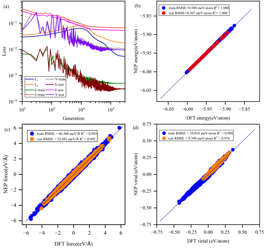 图1. (a) 训练集与测试集在能量、作用力和维里项上的损失函数。(b)-(d) γ-NEP预测值与DFT参考值在训练集和测试集中,对能量、作用力和维里应力的分别对比。