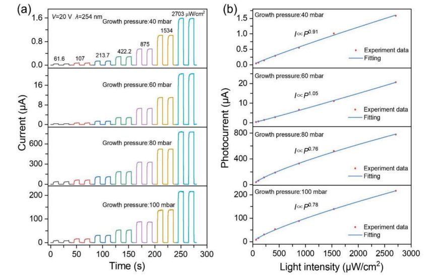 图 4. (a) 器件在 20 V 条件下,254 nm 光照及不同光强下的光响应时间演化;(b) 20 V 条件下光电流随光强的变化关系。