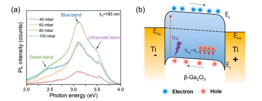 图 7. (a) 不同生长压力下 β-Ga2O3 薄膜的 PL 光谱;(b) β-Ga2O3 MSM 光电探测器在 20 V 条件下 254 nm UV 光照下的能带示意图。