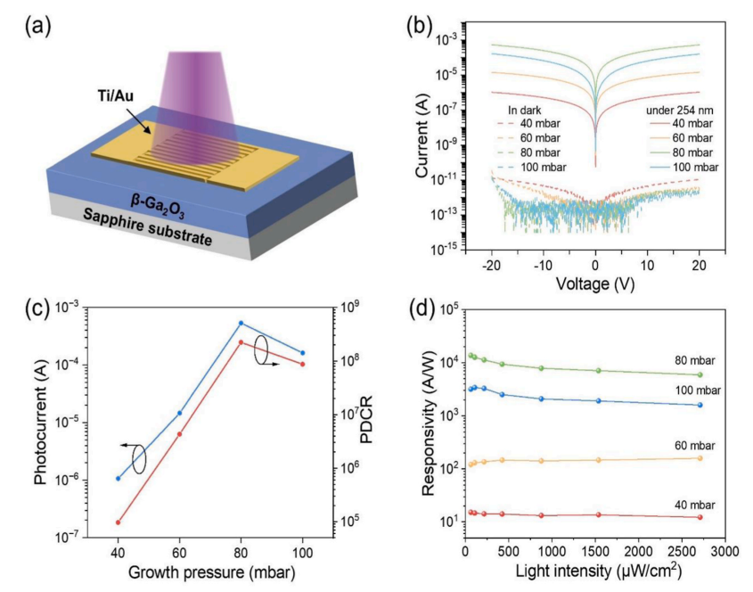 图 3. (a) β-Ga2O3MSM 光电探测器的示意图;(b) β-Ga2O3 MSM 光电探测器在暗态及 254 nm、光强为 1.54 mW/cm2 的照射下的 I–V 特性;(c) 20 V 条件下光电流及光暗电流比随生长压力的变化;(d) β-Ga2O3 光电探测器在不同光强下的响应度。