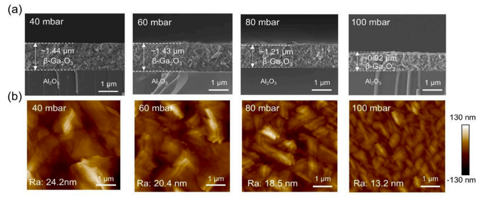 图 2. (a) 在不同生长压力下生长的 β-Ga2O3 薄膜的截面 SEM 图像;(b) 相应薄膜的表面 AFM 形貌图。
