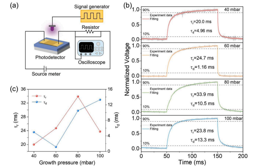 图 5. (a) 瞬态响应测试平台示意图;(b) 在 254 nm LED 光调制频率为 5 Hz 条件下,不同生长压力 β-Ga2O3 光电探测器的瞬态光响应特性;(c) β-Ga2O3 光电探测器响应时间与生长压力的关系。