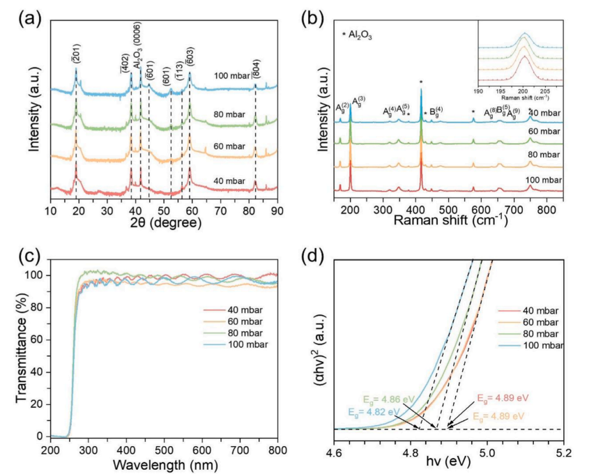 图 1. (a) 在不同生长压力下,生长于蓝宝石衬底上的 β-Ga2O3 薄膜的 XRD 图谱。(b) 在各种生长压力下制备的 β-Ga2O3 薄膜的拉曼光谱,插图显示 β-Ga2O3 在 200 cm-1 处拉曼活性峰的拟合结果。(c) β-Ga2O3 薄膜的光学透射光谱。(d) 用于光学带隙计算的 β-Ga2O3 薄膜 Tauc 图。