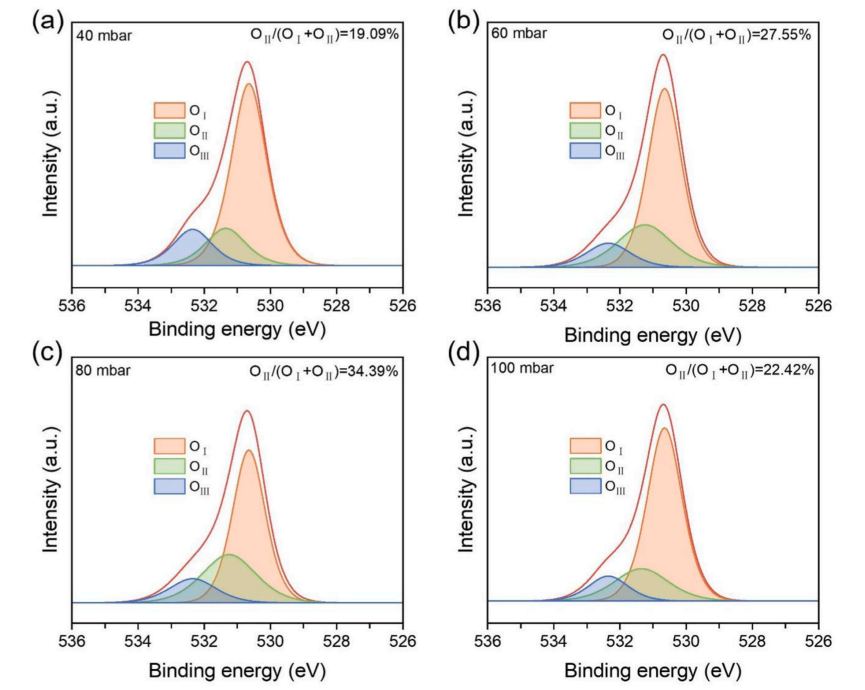 图 6. 不同生长压力下 β-Ga2O3 薄膜的 O 1s 核能级 XPS 光谱:(a) 40 mbar,(b) 60 mbar,(c) 80 mbar,(d) 100 mbar。