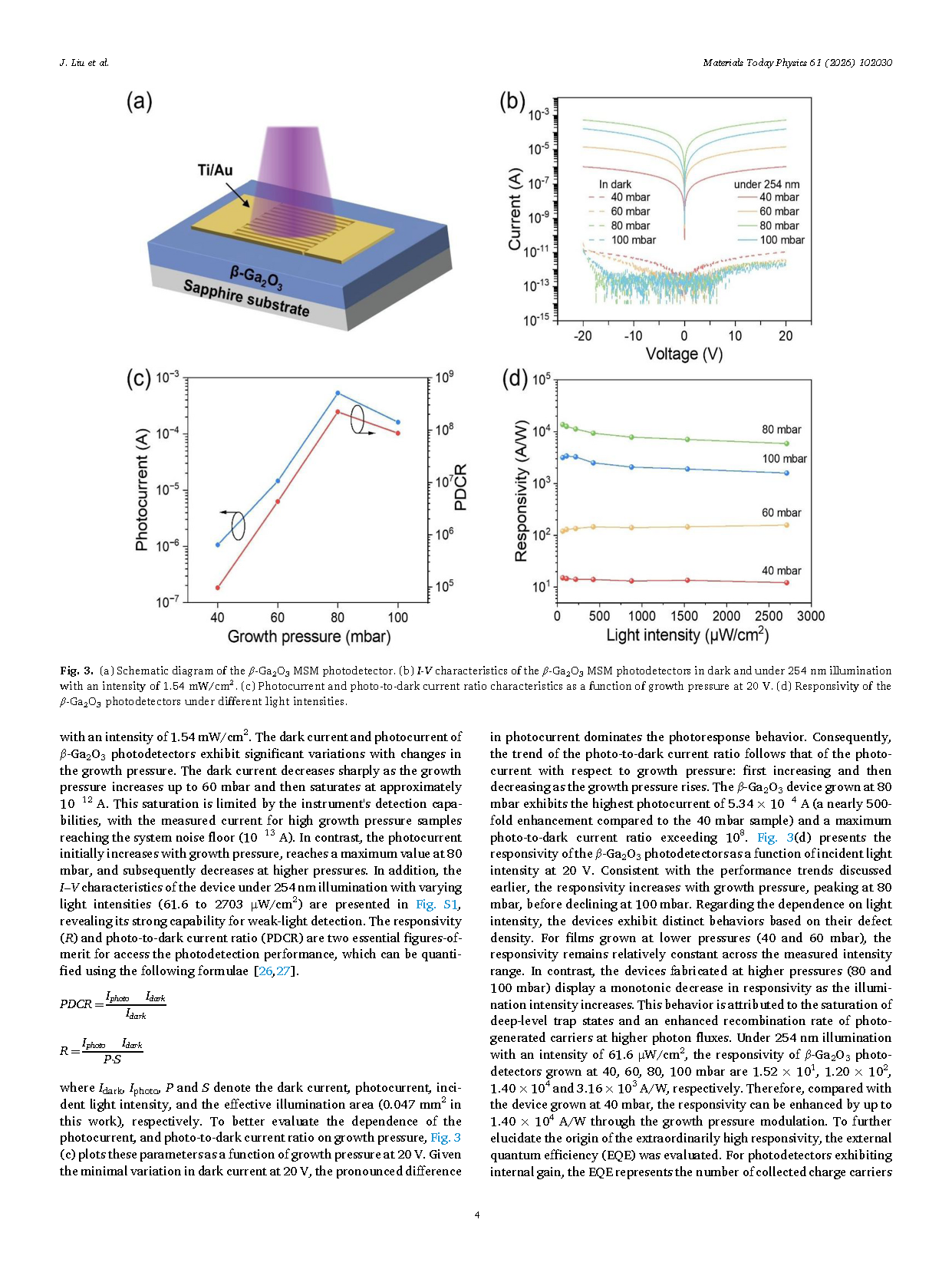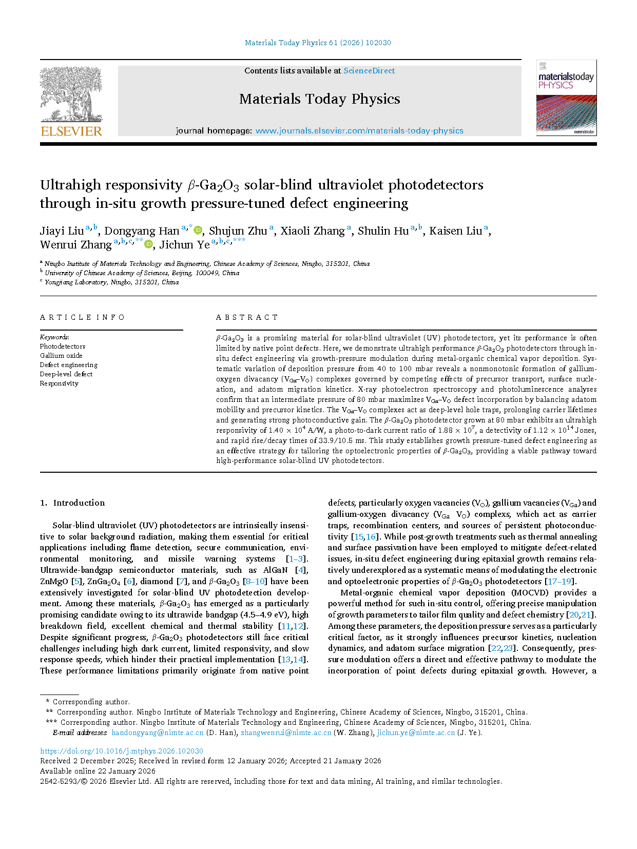 由中科院宁波材料技术与工程研究所张文瑞研究员的研究团队在学术期刊 Materials Today Physics 发布了一篇名为Ultrahigh Responsivity β-Ga₂O₃ Solar-Blind Ultraviolet Photodetectors through In-situ Growth Pressure-Tuned Defect Engineering(通过原位生长压力调控缺陷工程实现超高响应度的 β-Ga₂O₃ 日盲紫外光电探测器)的文章。
