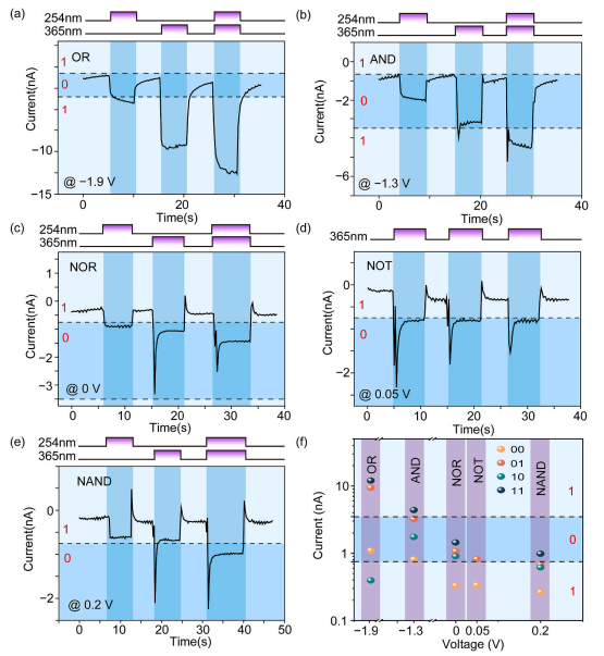 图6. 基于 Pt NP 修饰的β-Ga2O3/n-GaN异质结器件的可重构光电逻辑运算。演示五种基本逻辑门:(a) NOR, (b) NAND, (c) NOT, (d) AND, (e) OR。(f) 五种光逻辑门稳态光电流输出的总结真值表。原始稳态电流均为负值,因此纵轴上的电流范围和阈值区间均以绝对值表示。