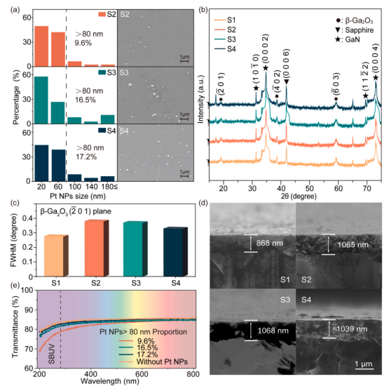 图2. (a) 不同样品中 Pt 纳米粒子的 SEM 形态及其对应的粒径分布统计;(b) 不同样品的 XRD 衍射图谱;(c) 不同样品中 β-Ga2O3 层 (–201) 晶面的半高全宽 (FWHM) 对比;(d) 不同样品的截面 SEM 图像。标记为 S1、S2、S3 和 S4 的四种样品分别对应在 GaN 衬底上沉积厚度为 0(无 Pt 薄膜)、6.4、10.9 和 15.4 nm 的初始 Pt 薄膜后经热氧化处理的样品。(e) 未经 Pt NPs 修饰的蓝宝石衬底与不同 Pt NPs 覆盖率(>80纳米颗粒比例:9.6%、16.5%、17.2%)蓝宝石衬底的透射光谱对比。