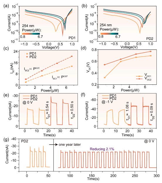 图4. PD1 与 PD2 器件的光电性能对比:(a) PD1 和 (b) PD2 的功率依赖性 I-V 特性曲线。(c) 器件在不同光照强度下的 ISC 变化及其拟合因子。(d) 器件光照强度对开路电压(VOC) 的影响。器件在 6.7 μW 254 nm 光照下、分别施加 0 V 偏压 (e) 与 -1 V 偏压 (f) 时的 I-t 曲线。 (g) 周期性 254 nm 6.7 μW 光照下,PD2 器件在 0 V 偏压条件下光电流的稳定性与可重复性。