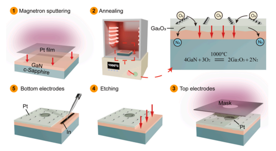图1. 通过高温热氧化法制备 Pt 纳米粒子修饰的 Pt/β-Ga2O3/n-GaN 短波紫外光探测器的工艺示意图。