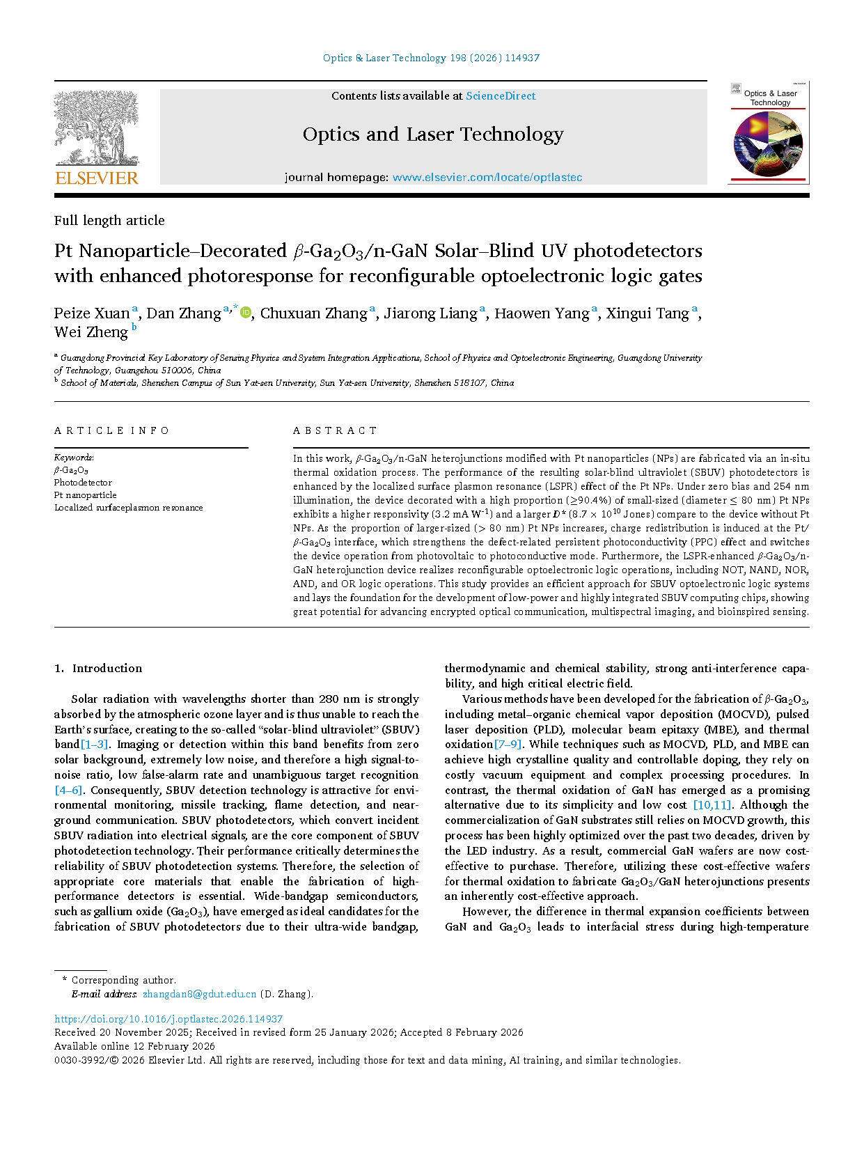 由广东工业大学的研究团队在学术期刊 Optics & Laser Technology 发布了一篇名为 Pt Nanoparticle–Decorated β-Ga2O3/n-GaN Solar–Blind UV photodetectors with enhanced photoresponse for reconfigurable optoelectronic logic gates(负载铂纳米颗粒的 β-Ga2O3/n-GaN 日盲紫外光电探测器及其在可重构光电逻辑门中的应用)的文章。