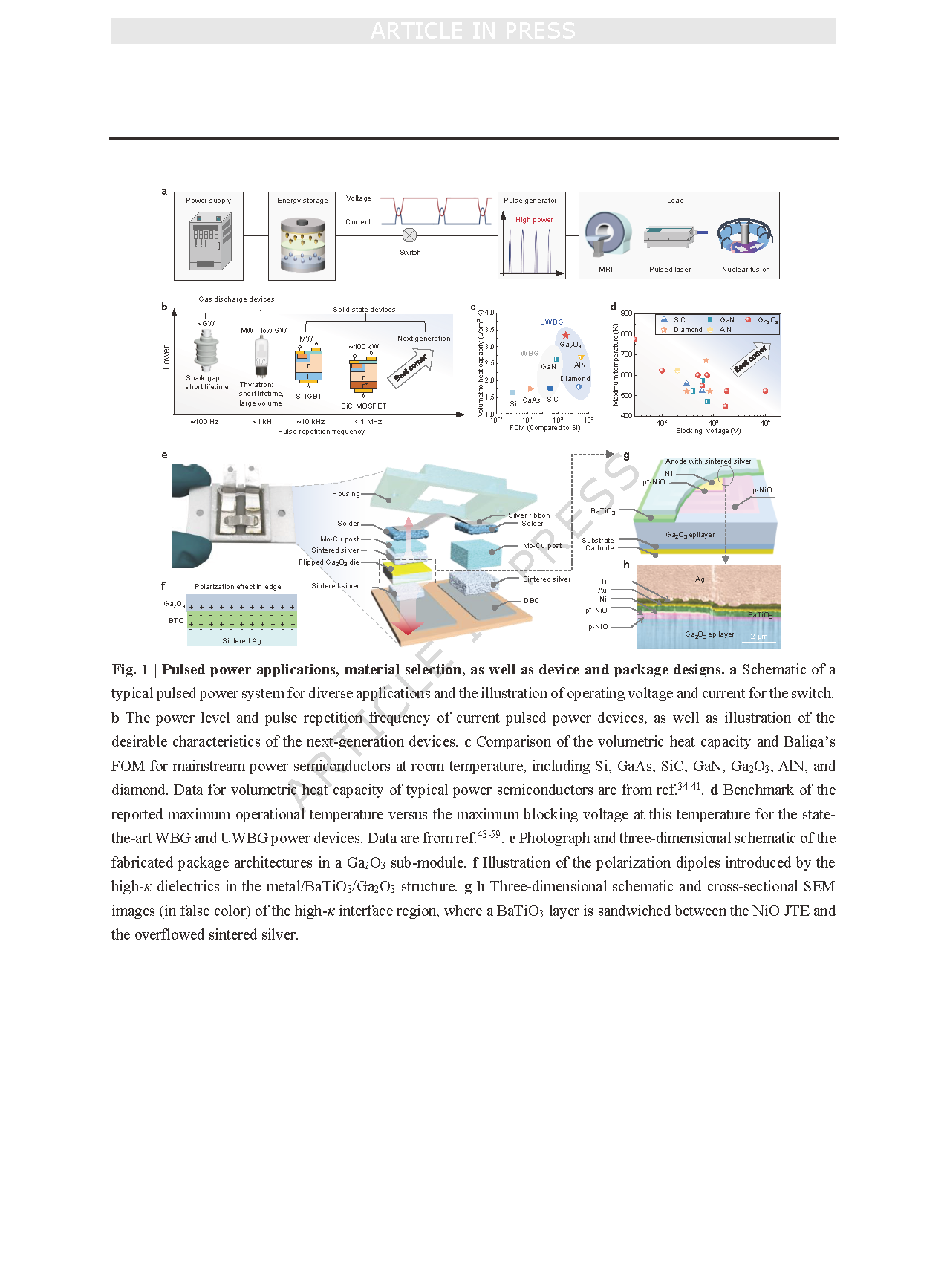 图 1 | 脉冲功率应用、材料选型以及器件与封装设计。a 适用于多种应用的典型脉冲功率系统示意图,以及开关的工作电压和电流说明。b 当前脉冲功率器件的功率水平和脉冲重复频率,以及下一代器件的期望特性。c 室温下主流功率半导体(包括硅(Si)、砷化镓(GaAs)、碳化硅(SiC)、氮化镓(GaN)、氧化镓(Ga₂O₃)、氮化铝(AlN)和金刚石)的体积热容与巴利加优值对比。典型功率半导体的体积热容数据来源于参考文献 34-41。d 最先进的宽禁带(WBG)和超宽禁带(UWBG)功率器件的最高工作温度与其对应温度下最高阻断电压的基准对比。e 所报道的氧化镓(Ga₂O₃)子模块封装结构的照片及三维示意图。f 金属 / 钛酸钡(BaTiO₃)/ 氧化镓(Ga₂O₃)结构中高介电常数电介质引入的极化偶极子示意图。g-h 高介电常数(high-κ)界面区域的三维示意图和横截面扫描电子显微镜(SEM)图像(伪彩色),该区域中钛酸钡(BaTiO₃)层夹在氧化镍结终端扩展区和溢流烧结银之间。