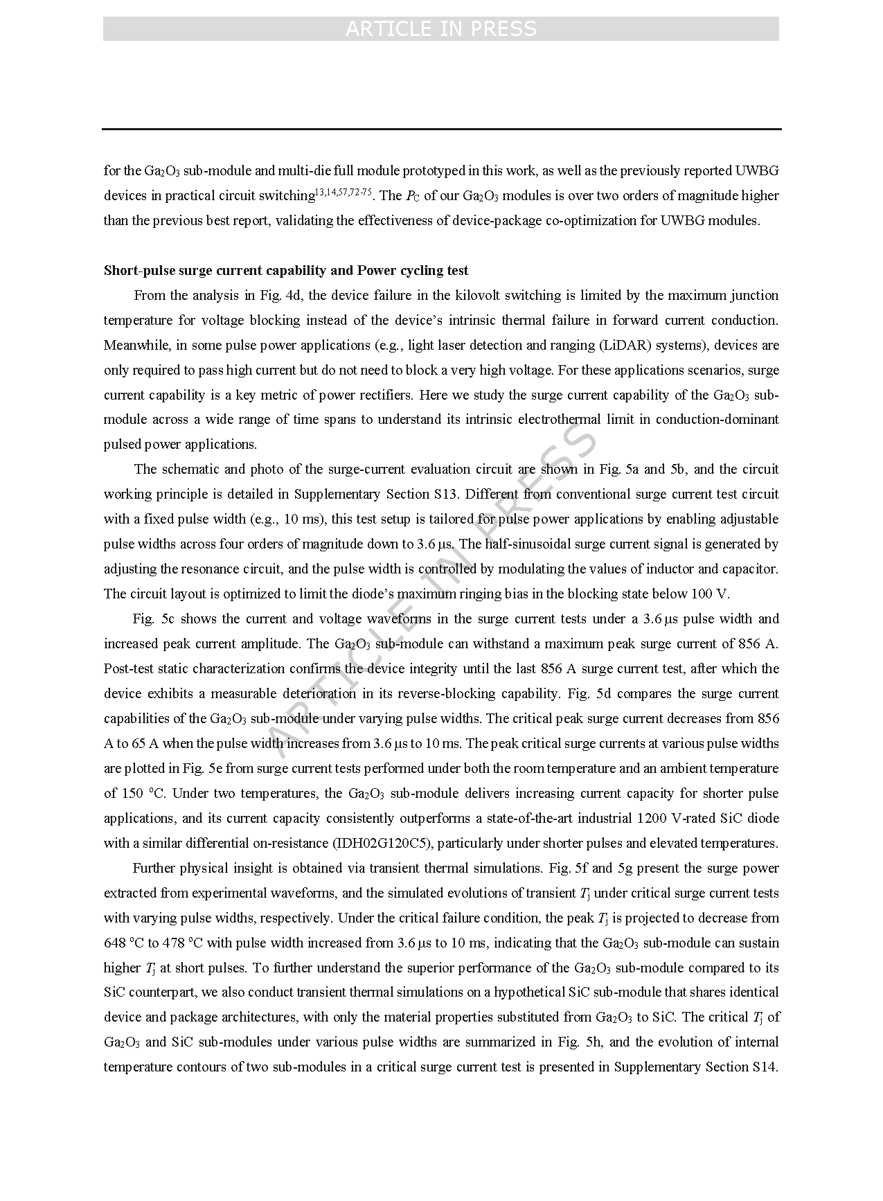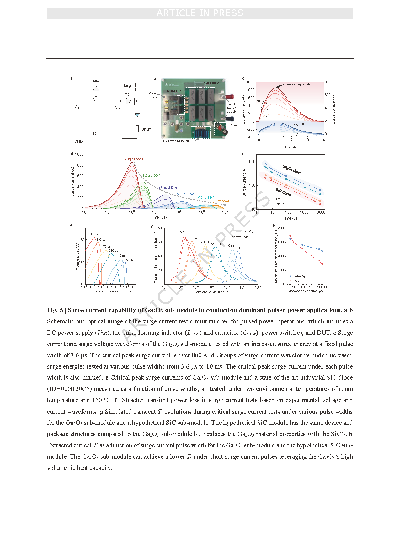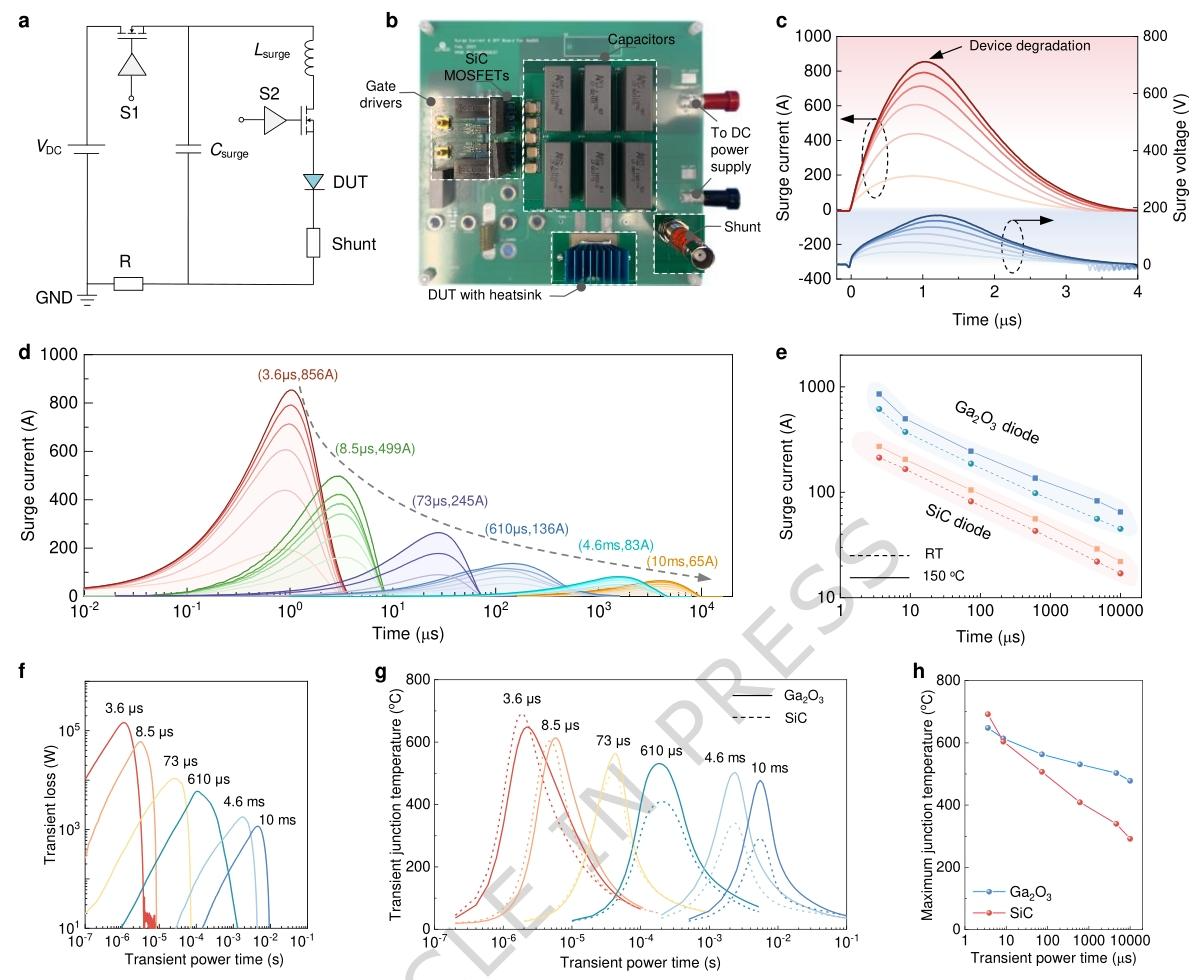 图 5 | 导通主导型脉冲功率应用中氧化镓(Ga₂O₃)子模块的浪涌电流能力。a–b 专为脉冲功率工作定制的浪涌电流测试电路的示意图及光学图像,该电路包括一个直流电源(VDC)、脉冲形成电感(Lsurge)、脉冲形成电容(Csurge)、功率开关以及待测试器件(DUT)。c 固定脉冲宽度为 3.6 微秒(µs)、浪涌能量不断增加的条件下,氧化镓(Ga₂O₃)子模块的浪涌电流和浪涌电压波形。临界峰值浪涌电流超过 800 安培(A)。d 脉冲宽度在 3.6 微秒(µs)至 10 毫秒(ms)之间变化、浪涌能量不断增加的条件下,多组浪涌电流波形。同时标记了每种脉冲宽度下的临界峰值浪涌电流。e 氧化镓(Ga₂O₃)子模块与最先进的工业级碳化硅(SiC)二极管(型号 IDH02G120C5)的临界峰值浪涌电流随脉冲宽度变化的测试结果,所有测试均在室温与 150℃两种环境温度下进行。f 基于实验测得的电压和电流波形,提取的浪涌电流测试中的瞬态功率损耗。g 不同脉冲宽度下,氧化镓(Ga₂O₃)子模块与假设的碳化硅(SiC)子模块在临界浪涌电流测试过程中的模拟瞬态结温(Tⱼ)演变曲线。该假设的碳化硅(SiC)子模块与氧化镓(Ga₂O₃)子模块具有相同的器件和封装结构,但将氧化镓(Ga₂O₃)的材料特性替换为碳化硅(SiC)的材料特性。h 氧化镓(Ga₂O₃)子模块与假设的碳化硅(SiC)子模块的临界结温(Tⱼ)随浪涌电流脉冲宽度变化的提取结果。依托氧化镓(Ga₂O₃)的高体积热容,氧化镓(Ga₂O₃)子模块在短脉冲浪涌电流条件下可实现更低的结温(Tⱼ)。