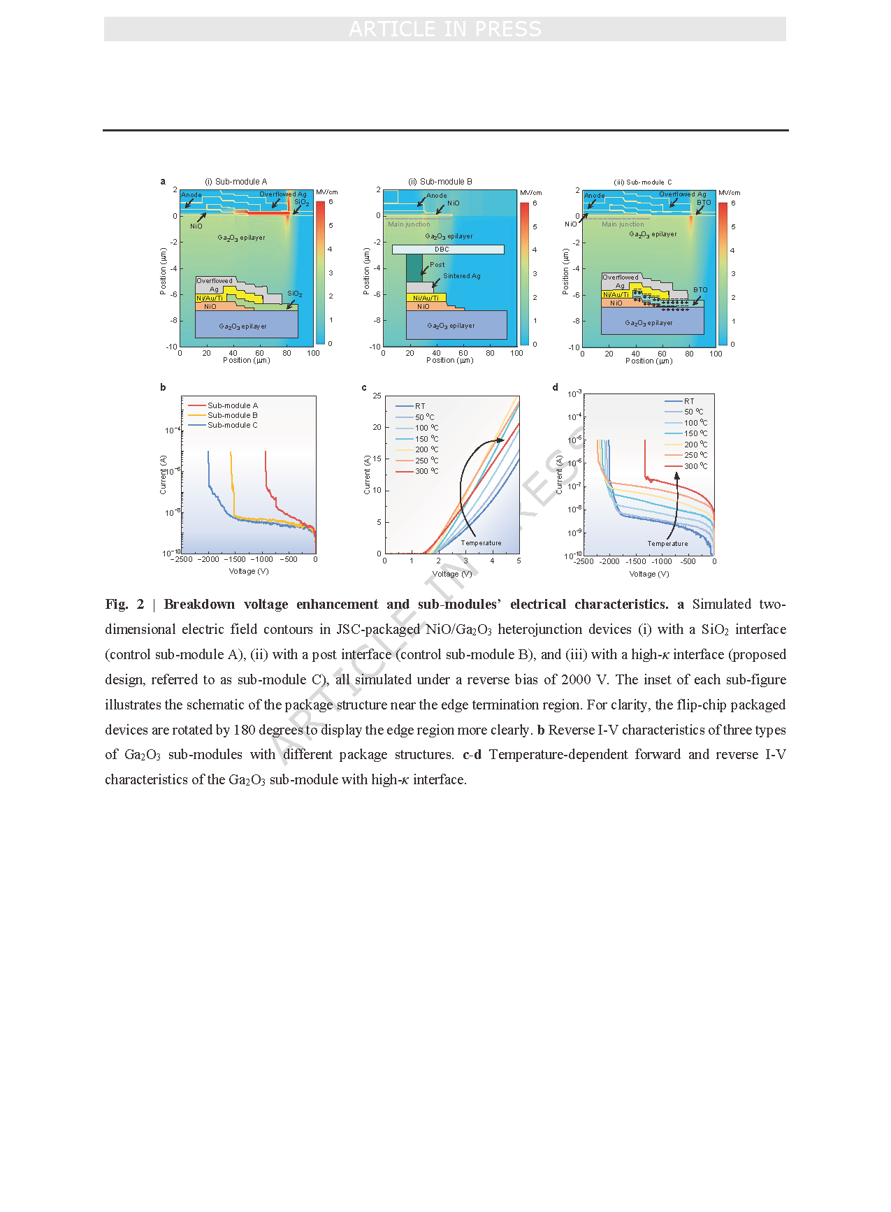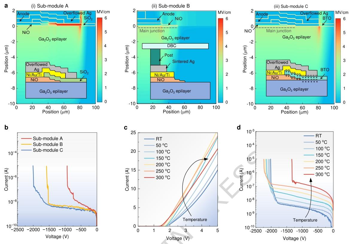 图 2 | 击穿电压提升与子模块的电学特性。a 反向偏压为 2000 V 条件下,JSC 封装的氧化镍 / 氧化镓(NiO/Ga₂O₃)异质结器件的二维电场分布模拟图:(i)采用二氧化硅(SiO₂)界面的器件(对照子模块 A)、(ii)采用凸台(post)界面的器件(对照子模块 B)、(iii)采用高介电常数(high-κ)界面的器件(所提出的设计方案,称为子模块 C)。每个子图的插图展示了终端区域附近封装结构的示意图。为清晰起见,倒装芯片封装的器件旋转了 180 度,以更清楚地显示边缘区域。b 三种不同封装结构的氧化镓(Ga₂O₃)子模块的反向电流 - 电压(I–V)特性。c–d 采用高介电常数(high-κ)界面的氧化镓(Ga₂O₃)子模块的温度依赖性正向及反向电流 - 电压(I–V)特性。