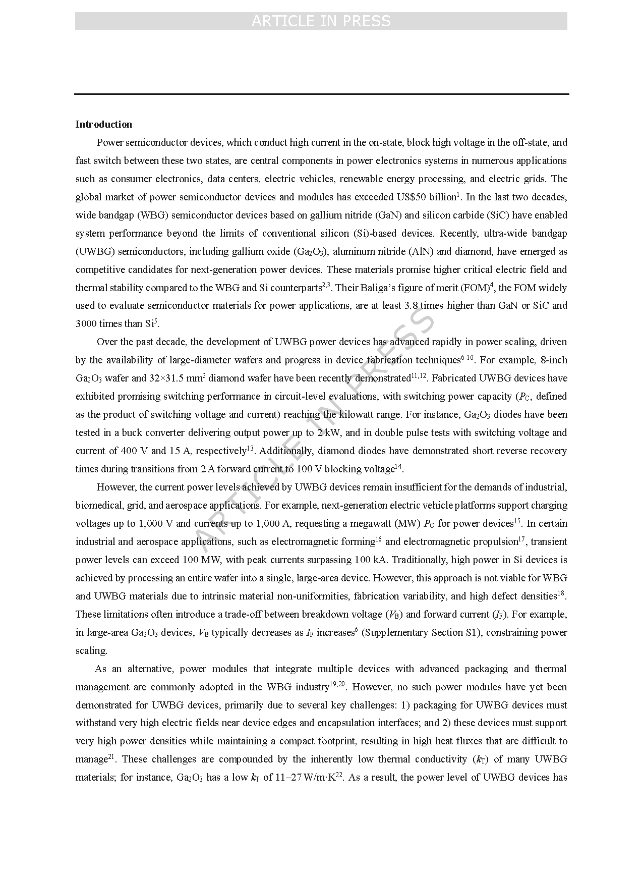 功率半导体器件是消费电子、数据中心、电动汽车、可再生能源与电网等电力电子系统的核心,全球市场规模已超 500 亿美元。近 20 年,氮化镓( GaN )、碳化硅( SiC )等宽禁带( WBG )半导体突破传统硅( Si )器件极限;近年来,氧化镓( Ga₂O₃ )、氮化铝( AlN )、金刚石等超宽禁带( UWBG )材料凭借更高临界电场与热稳定性,成为下一代功率器件优选,其 Baliga 优值至少为 GaN/SiC 的 3.8 倍、硅的 3000 倍。