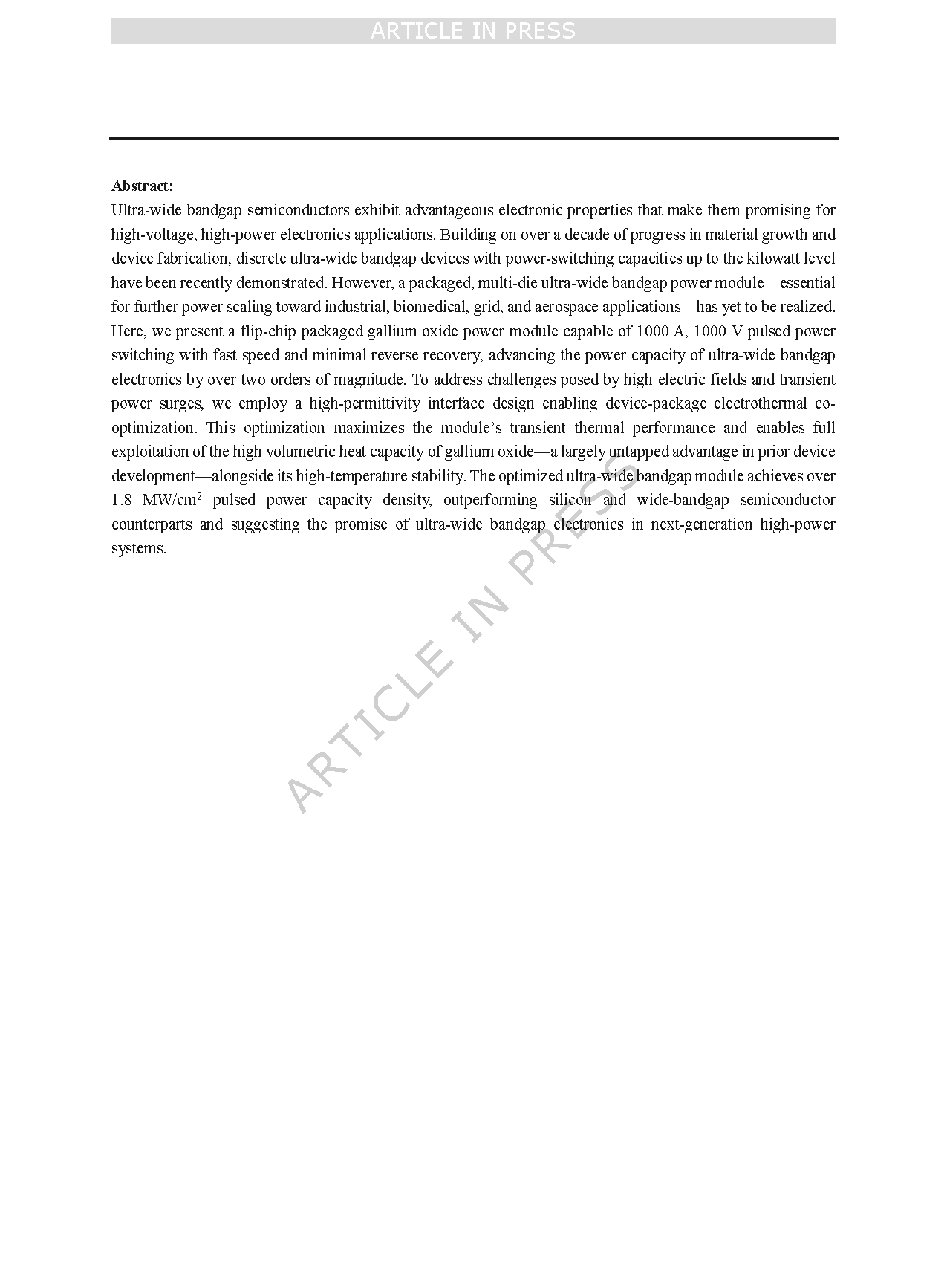 超宽禁带半导体具备优异电学特性,在高压、大功率电子应用中潜力突出。历经十余年材料生长与器件工艺进步,分立型超宽禁带器件开关功率已达千瓦级,但面向工业、生物医学、电网、航空航天等应用的封装式多芯片超宽禁带功率模块仍未实现。该团队提出一种倒装芯片封装的氧化镓功率模块,可实现 1000 A、1000 V 脉冲功率开关,速度快、反向恢复极小,将超宽禁带电子功率容量提升两个数量级以上。为应对强电场与瞬态功率冲击,该团队采用高介电常数界面设计,实现器件–封装电热协同优化,最大化模块瞬态热性能,充分挖掘氧化镓高体积热容与高温稳定性优势。该优化超宽禁带模块脉冲功率容量密度超 1.8 MW/cm²,优于硅与宽禁带半导体器件,印证超宽禁带电子在下一代大功率系统的应用前景。