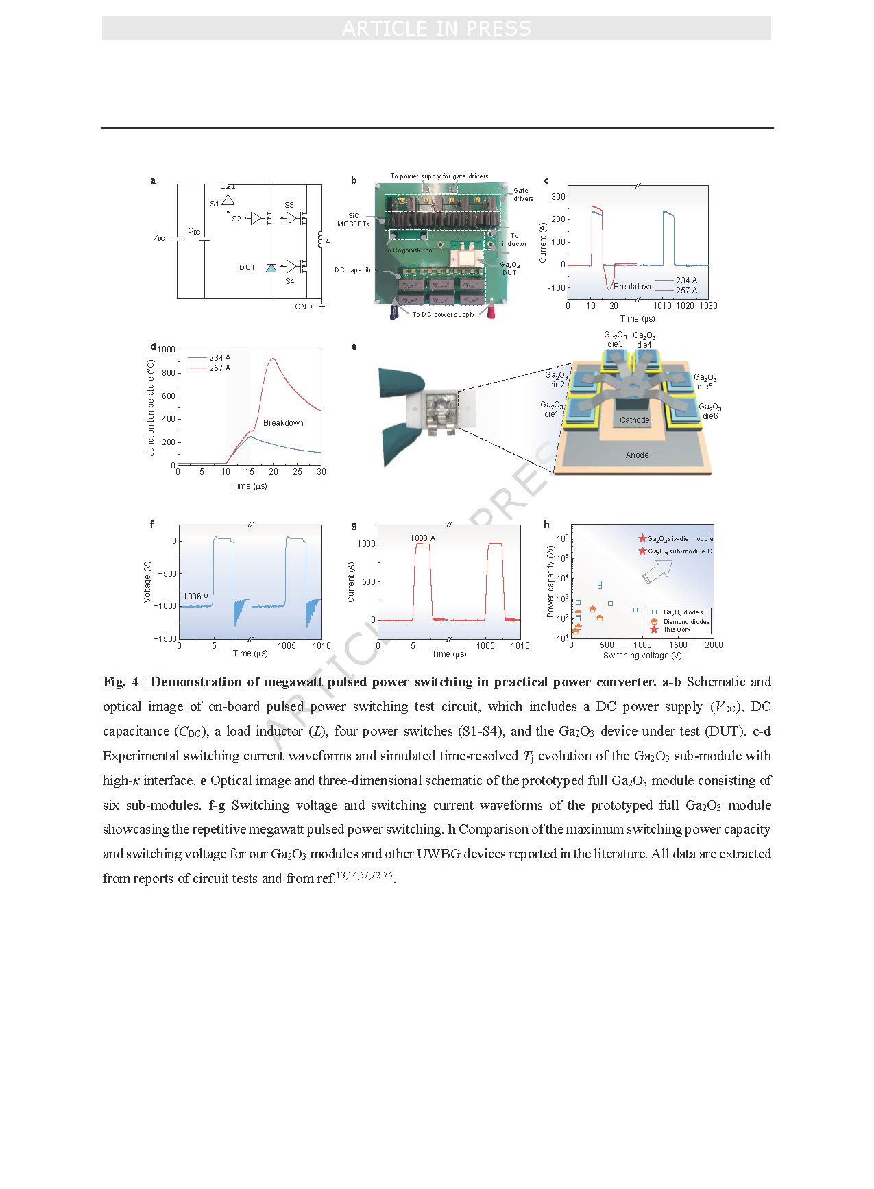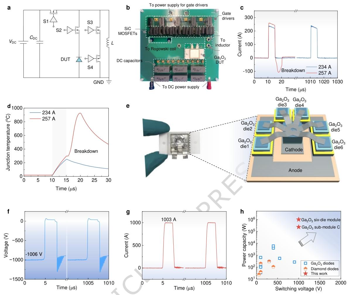 图 4 | 实际功率变换器中兆瓦级脉冲功率开关的验证。a–b 车载脉冲功率开关测试电路的示意图及光学图像,该电路包括一个直流电源(VDC)、直流电容(CDC)、一个负载电感(L)、四个功率开关(S1–S4)以及待测试的氧化镓(Ga₂O₃)器件(DUT)。c–d 采用高介电常数(high-κ)界面的氧化镓(Ga₂O₃)子模块的实验开关电流波形及模拟的时间分辨结温(Tⱼ)演变曲线。e 由六个子模块组成的原型全氧化镓(Ga₂O₃)模块的光学图像及三维示意图。f–g 原型全氧化镓(Ga₂O₃)模块的开关电压和开关电流波形,展示了其重复兆瓦级脉冲功率开关性能。h 该团队的氧化镓(Ga₂O₃)模块与文献中报道的其他超宽禁带(UWBG)器件在最大开关功率容量和开关电压方面的对比。