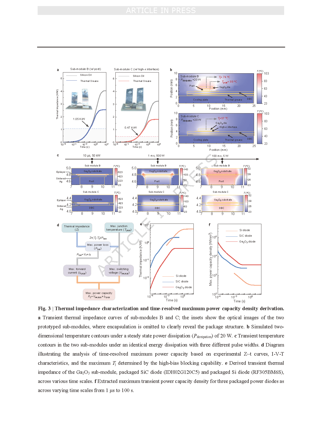 图 3 | 热阻表征与时间分辨最大脉冲功率容量密度推导。a 子模块 B 和子模块 C 的瞬态热阻曲线;插图展示了两个原型子模块的光学图像,其中省略了封装部分以清晰呈现封装结构。b 稳态功耗(Pdissipation)为 20 W 条件下的二维温度分布模拟图。c 相同能量耗散、三种不同脉冲宽度条件下,两个子模块的瞬态温度分布模拟图。d 基于实验测得的 Z~t 曲线、电流 - 电压 - 温度(I–V–T)特性以及由高偏压阻断能力确定的最高结温(Tⱼ),进行时间分辨最大功率容量分析的示意图。e 氧化镓(Ga₂O₃)子模块、封装碳化硅(SiC)二极管(型号 IDH02G120C5)和封装硅(Si)二极管(型号 RF305BM6S)在不同时间尺度下的推导瞬态热阻。f 三种封装功率二极管在 1 微秒(µs)至 100 秒(s)不同时间尺度下的提取最大瞬态功率容量密度。