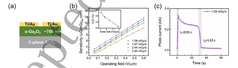 图 9 (a) α-Ga₂O₃ 薄膜探测器截面示意图;(b) α-Ga₂O₃ 薄膜灵敏度随外加电场的变化;(c) 1 V 偏压、1.09 mGyair s⁻¹ 剂量率下光电流脉冲的典型上升与下降动力学。