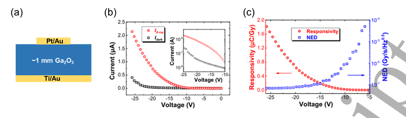 图 6 (a) 肖特基势垒二极管 X 射线探测器截面示意图;(b) β-Ga₂O₃ X 射线探测器的光电流(IX-ray)与暗电流(Idark);(c) 反向偏压下 β-Ga₂O₃ X 射线探测器的响应度与噪声等效剂量率。