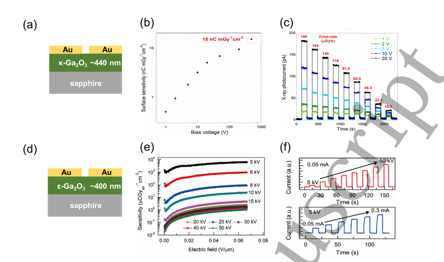 图 10 (a) κ-Ga₂O₃ 薄膜探测器示意图;(b) 制备的 κ-Ga₂O₃ X 射线探测器的面灵敏度;(c) X 射线开关循环下测试的光电导探测器时间依赖光电流 (d) ε-Ga₂O₃ 薄膜探测器示意图;(e) 基于 ε-Ga₂O₃的 X 射线探测器灵敏度;(f) 光电流开关响应。
