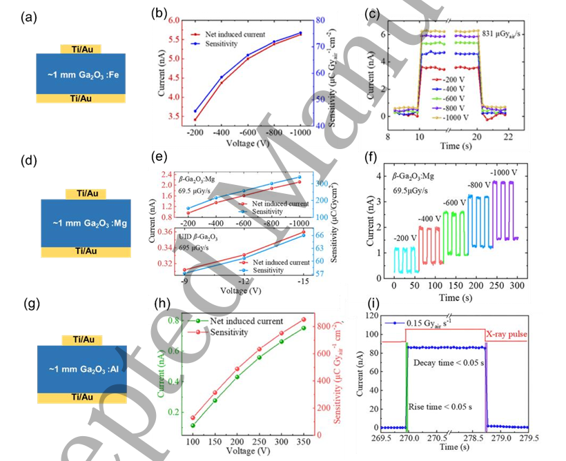 图 7 (a) Ga₂O₃:Fe 探测器截面示意图;(b) 制备的 Ga₂O₃:Fe 探测器的净感应电流与灵敏度;(c) 不同电压下探测器的时间响应曲线放大图 (d) Ga₂O₃:Mg 探测器截面示意图;(e) 不同偏压下探测器的净感应电流与灵敏度;(f) X 射线辐照下 Ga₂O₃:Mg 探测器的瞬态响应 (g) Ga₂O₃:Al 探测器截面示意图;(h) Ga₂O₃:Al 探测器的净感应电流与灵敏度特性;(i) 200V 下测试的 Ga₂O₃:Al 探测器响应时间特性。