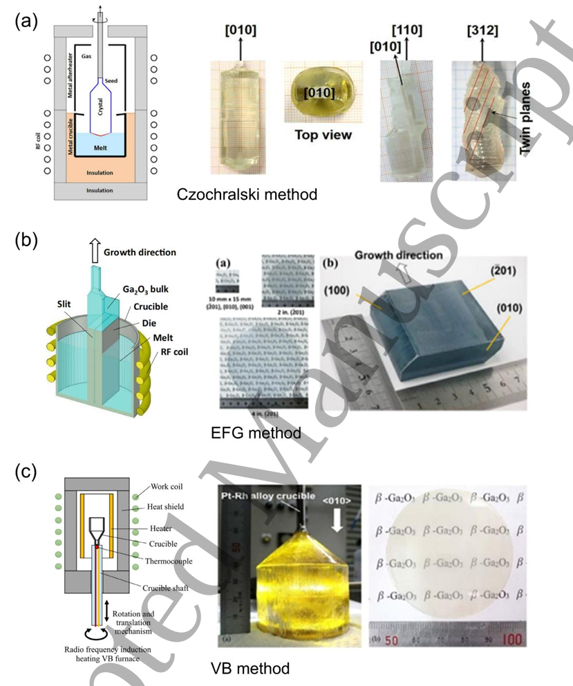 图 5 (a) 直拉法生长炉示意图与 β-Ga₂O₃ 晶体照片;(b) 导模法示意图与 EFG 法制备的 β-Ga₂O₃ 体晶体照片 (c) 垂直布里奇曼炉示意图与 2 英寸直径 Fe 掺杂 β-Ga₂O₃ 单晶照片。