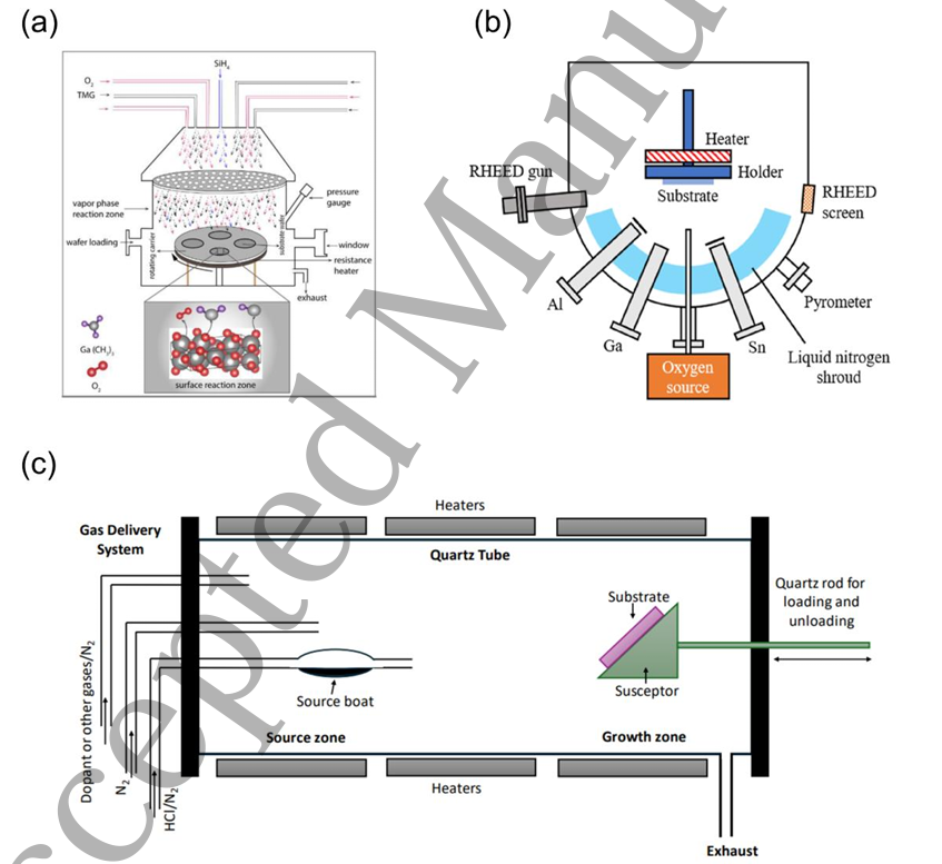 图 8 (a) 金属有机化学气相沉积反应腔示意图;(b) 分子束外延示意图 (c) 卤化物气相外延示意图。