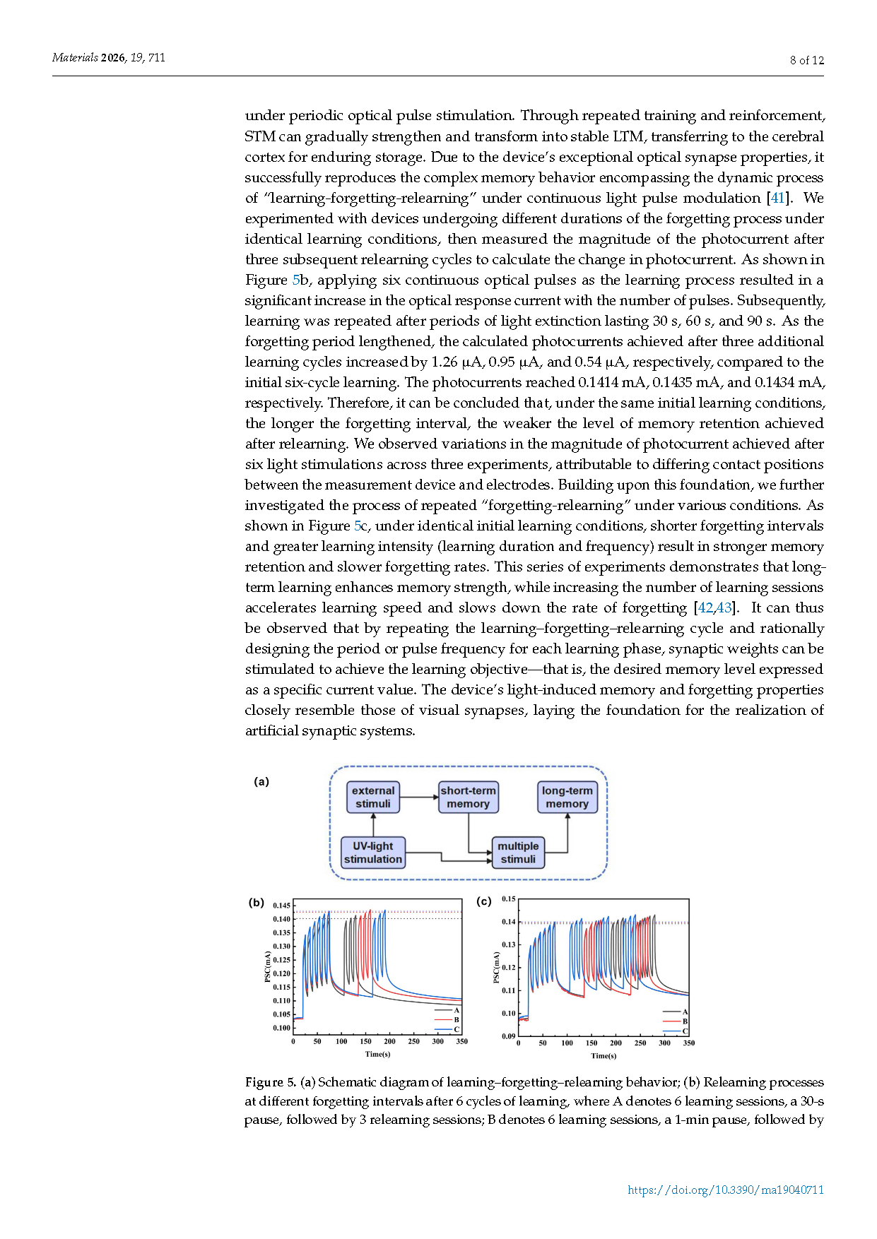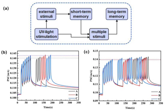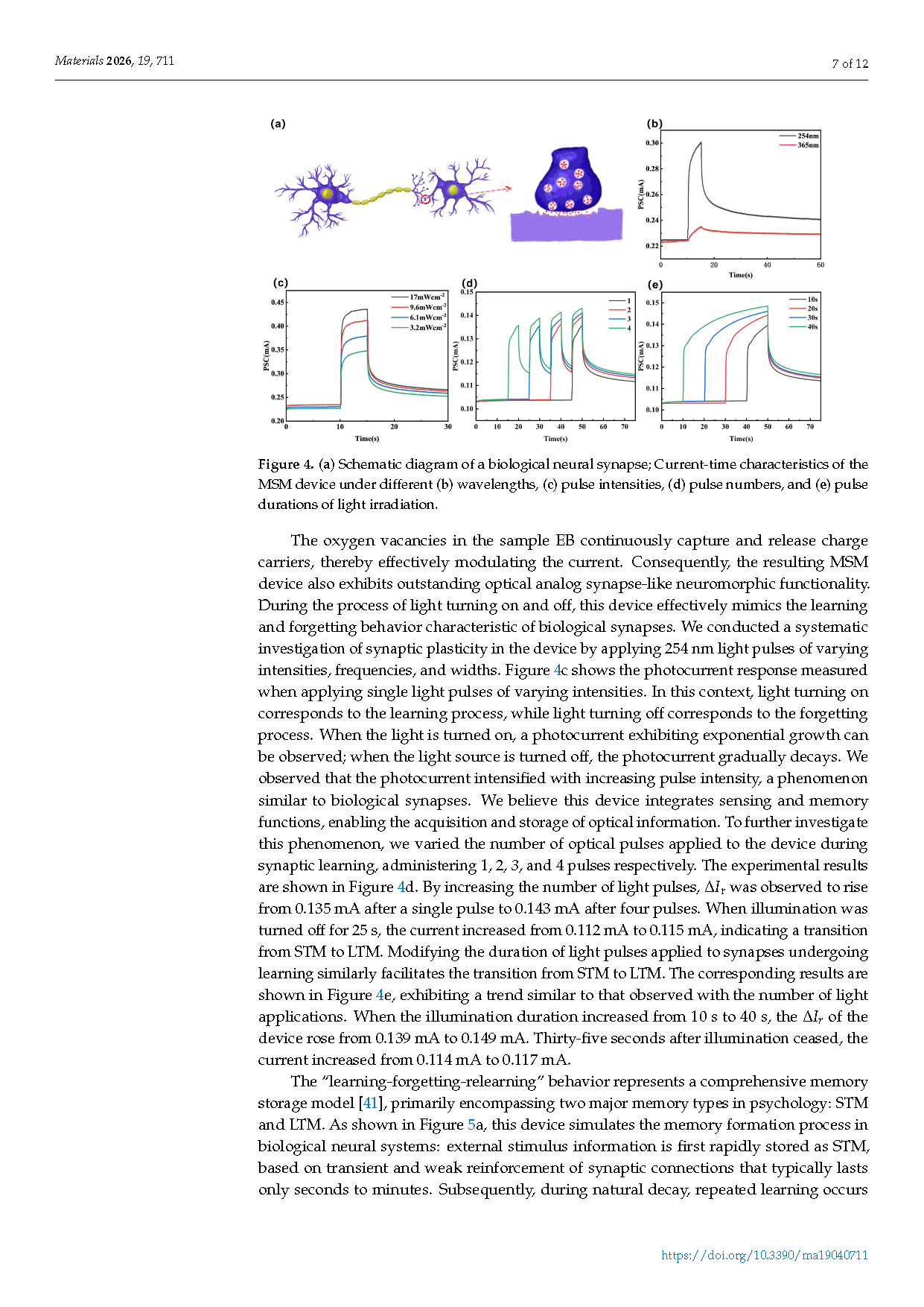 ●该器件完全通过光信号(254 nm 紫外光)驱动,成功模拟了生物突触的多种关键功能,包括:兴奋性突触后电流(EPSC)、从短程记忆(STM)到长程记忆(LTM)的转变、“学习-遗忘-再学习”的生物学过程。