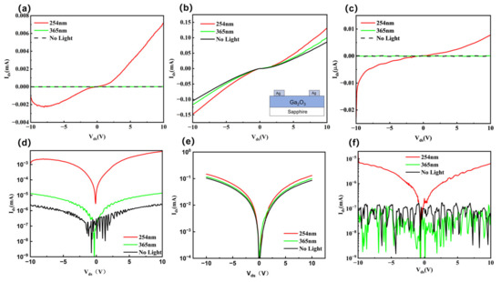 图2: 氧化镓薄膜上 Ag/Ag 电极的 I - V 特性。线性关系:(a)样品 E,(b)样品 EB,(c)样品 B,其中(b)中的插图显示了样品结构的示意图。对数关系:(d)样品 E,(e)样品 EB,(f)样品 B。