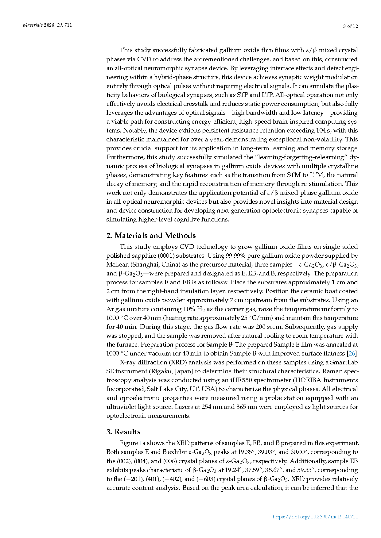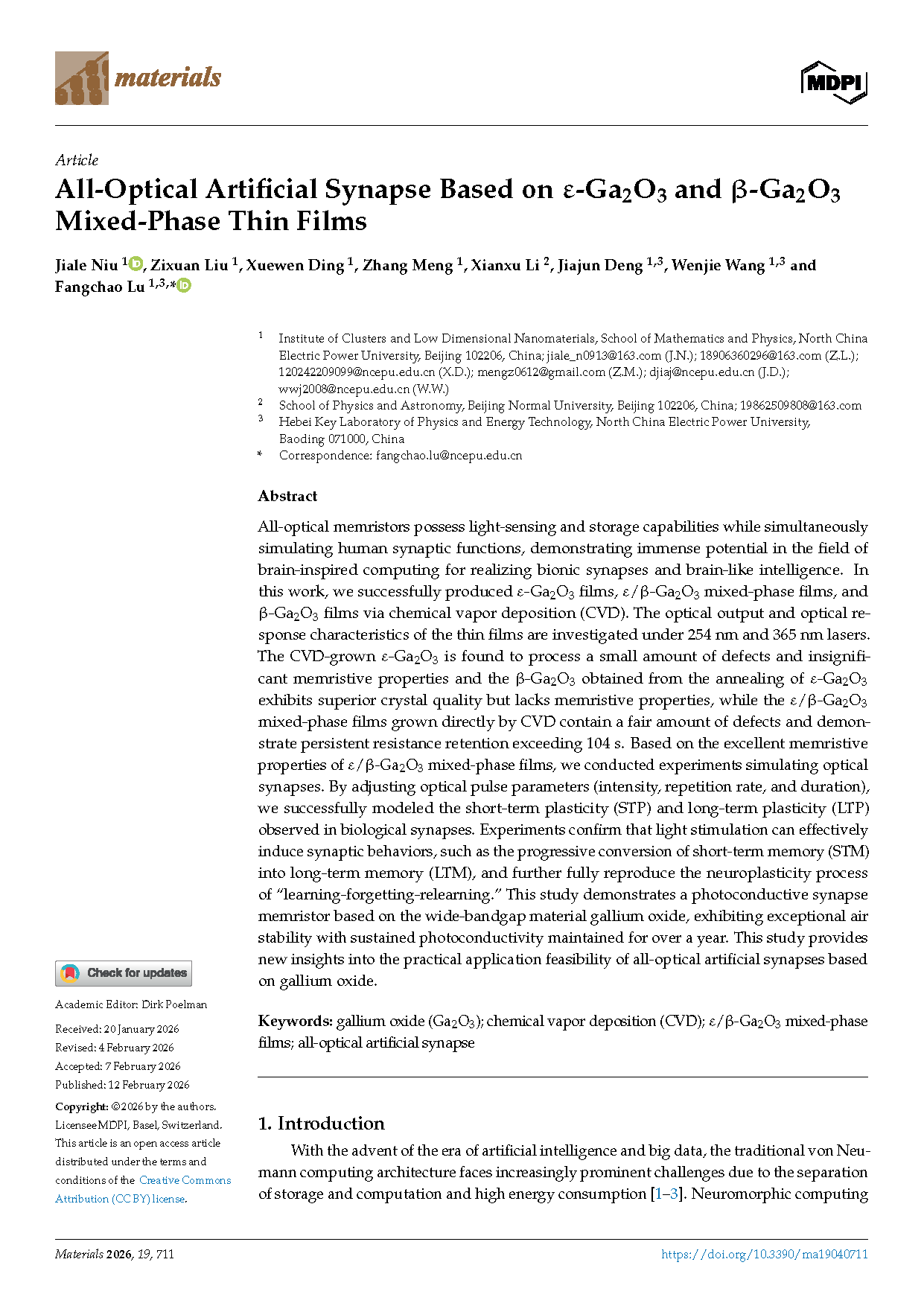 由华北电力大学的研究团队在学术期刊 Materials 发布了一篇名为 All-Optical Artificial Synapse Based on ε-Ga₂O₃ and β-Ga₂O₃ Mixed-Phase Thin Films(基于 ε-Ga₂O₃ 与 β-Ga₂O₃ 混合相薄膜的全光人工突触)的文章。
