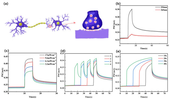 图4. (a) 生物神经突触示意图;MSM 器件在不同(b)波长(c)脉冲强度(d)脉冲次数和(e)光照射脉冲持续时间下的电流-时间特性。