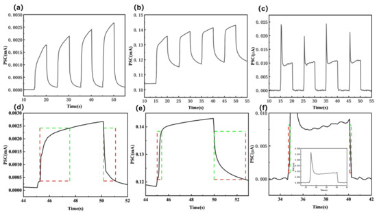 图3. 在 10 V 电压下对 254 nm 紫外光的光响应:(a)样品 E(b)样品 EB(c)样品 B;光诱导电流上升和衰减的实验曲线:(d)样品 E,(e)样品 EB,(f)样品 B。