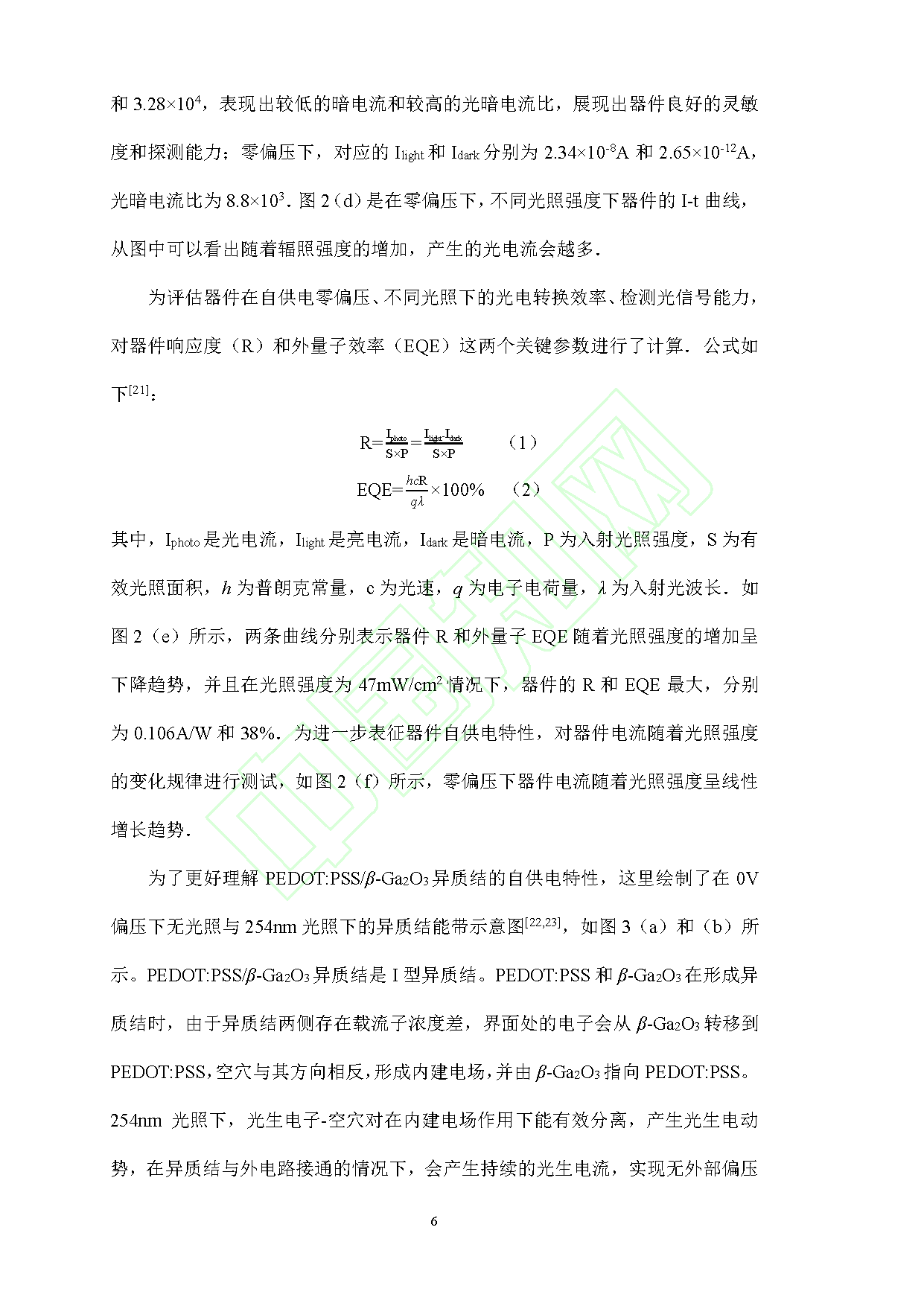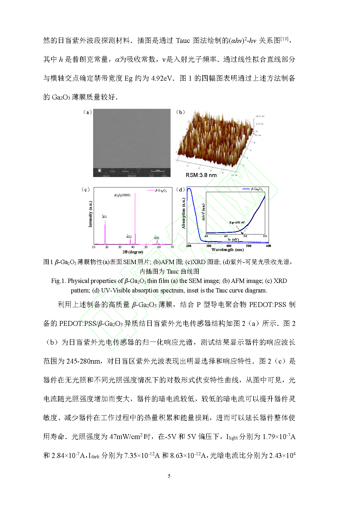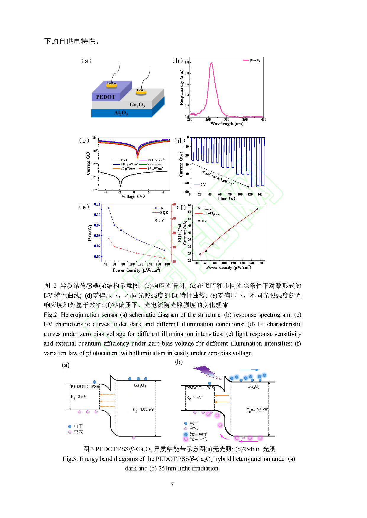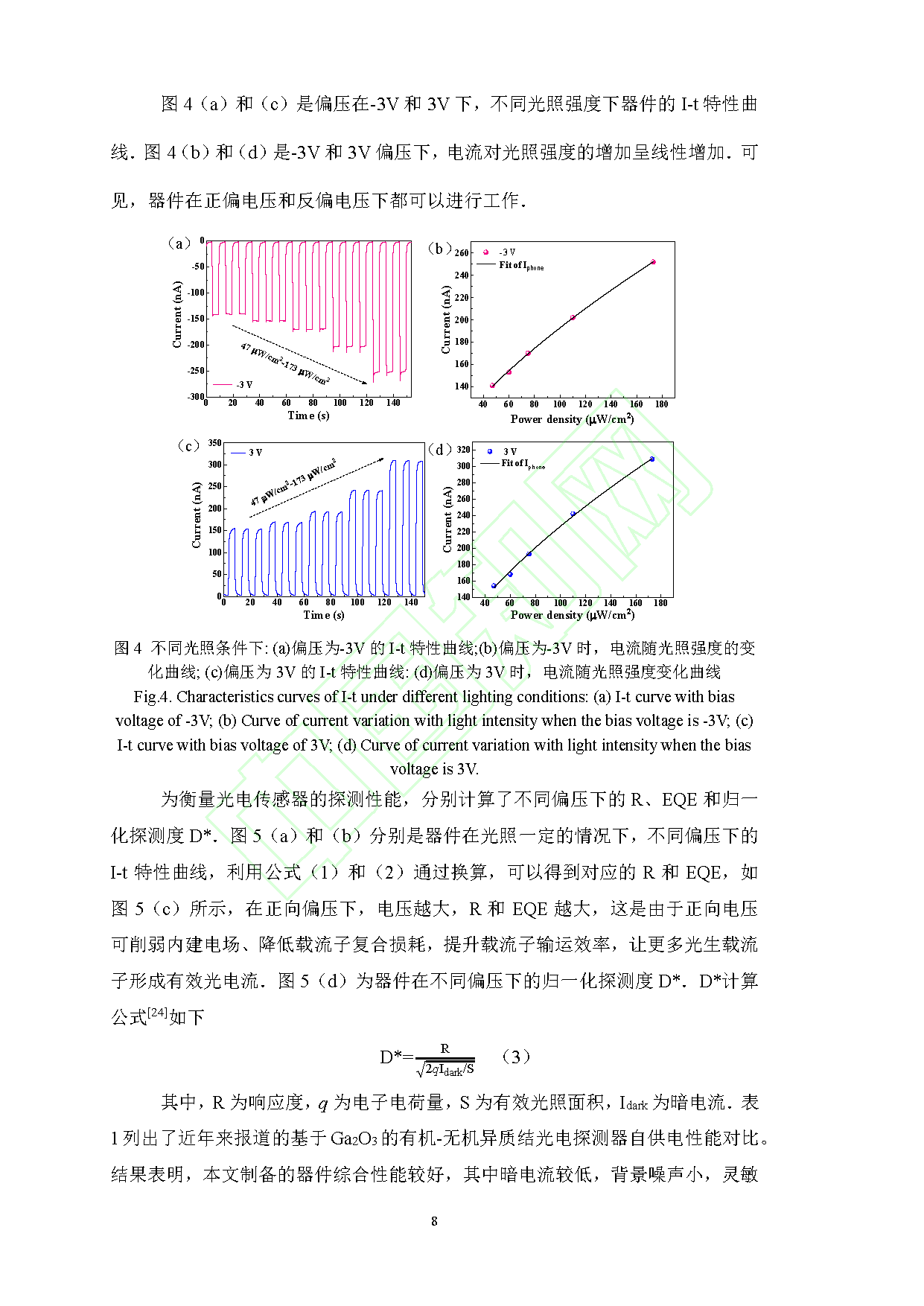 3.光电参数表现突出:254 nm 日盲光照下,光响应度为 0.106 A/W,外量子效率为 38%,光电流与光照强度呈良好线性关系。