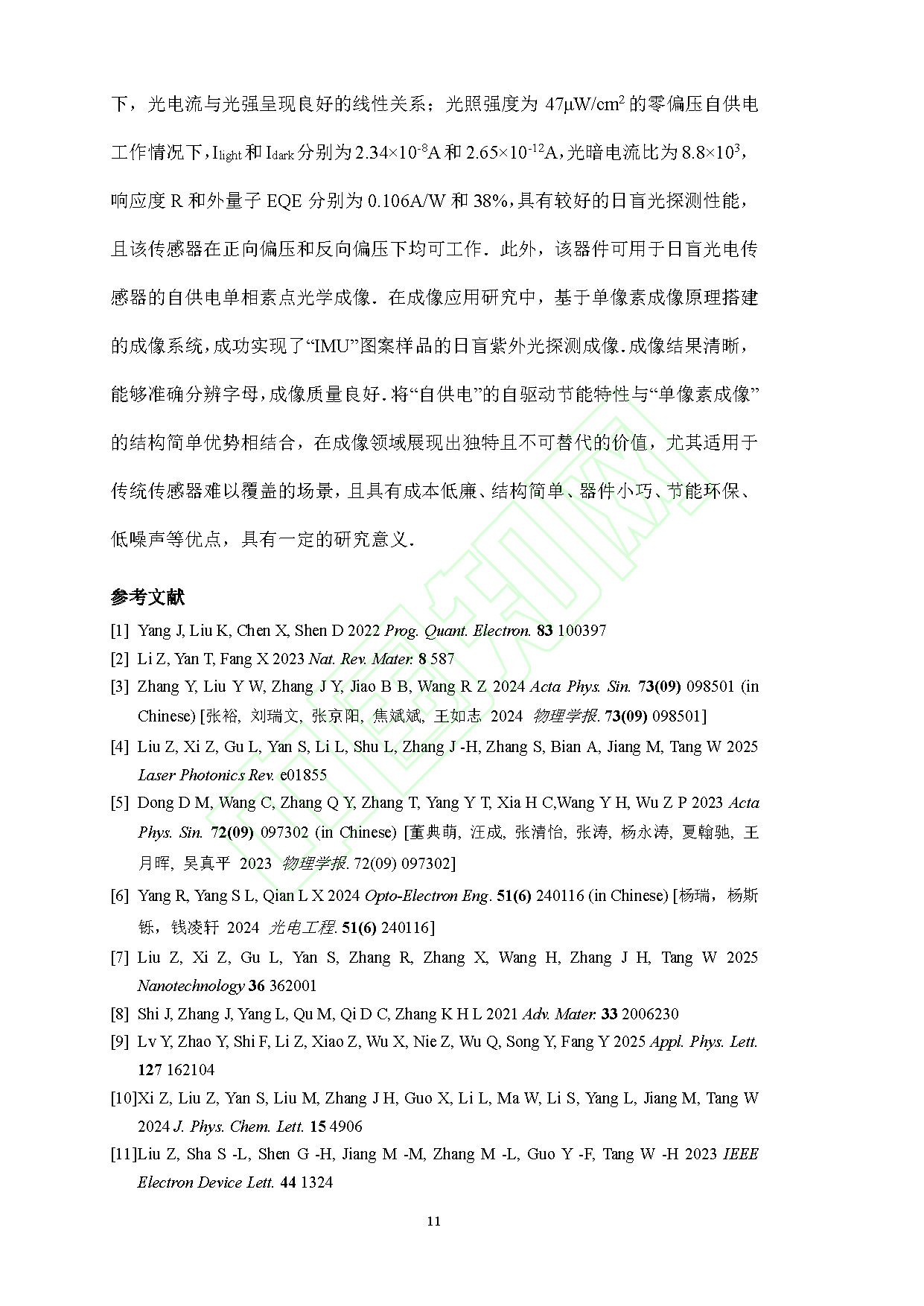 该团队成功制备可自供电工作的有机-无机范德瓦尔斯异质结日盲光电传感器,±5 V 偏压内暗电流<10⁻¹¹ A,噪声低,弱光探测与灵敏度表现优异;254 nm 紫外光下,光电流与光强呈良好线性关系。零偏压自供电状态下,器件光暗电流比、光响应度、外量子效率均达优异水平,且正、反偏压下均可稳定工作。该传感器基于单像素成像原理,成功完成“IMU”图案日盲紫外成像,成像质量良好。该器件融合自供电节能与单像素成像结构简单的优势,具备成本低、结构简、器件小巧、节能环保、低噪声等特点,在传统传感器难以适配的场景中具有独特价值,为日盲紫外探测与单像素成像技术发展提供了新路径。