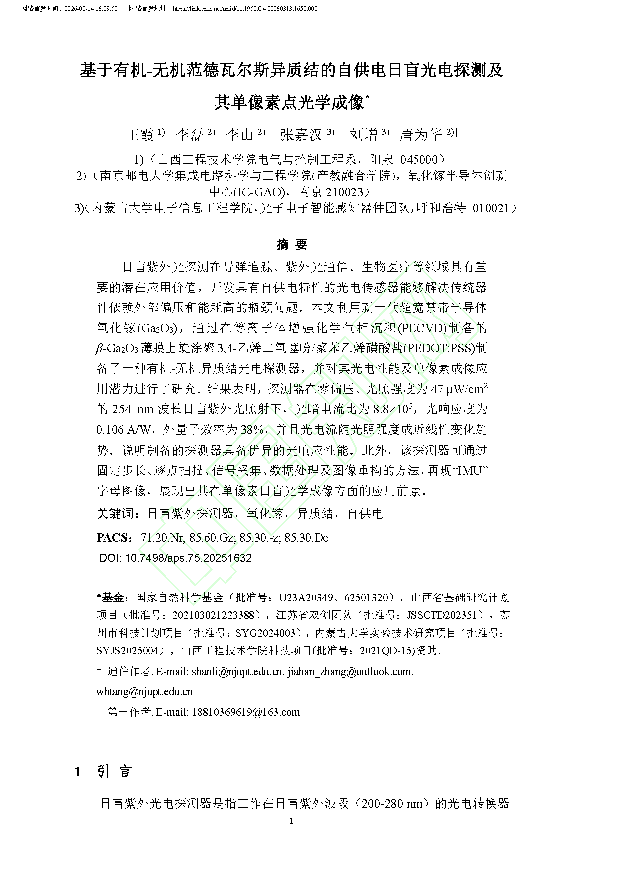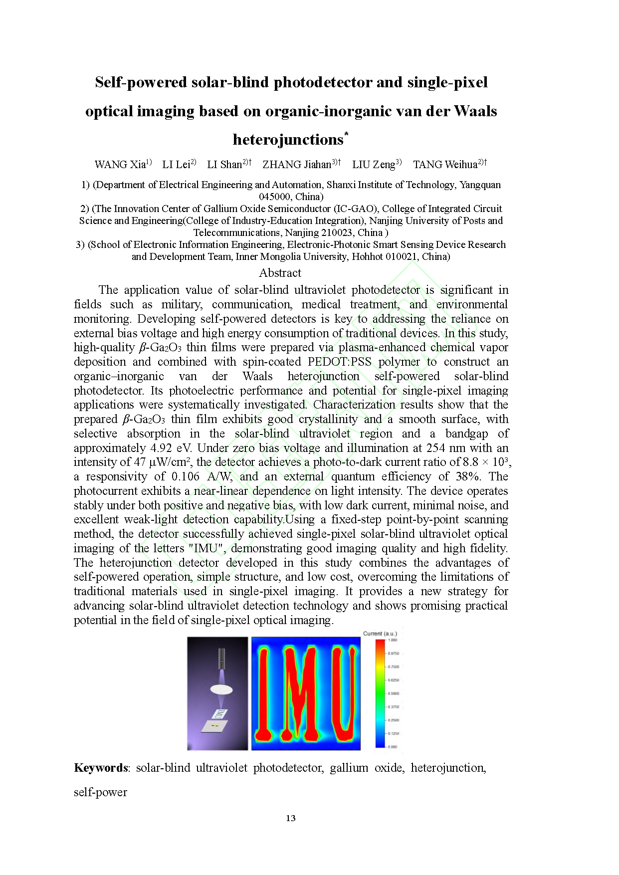 由南京邮电大学唐为华教授、李山副教授、内蒙古大学刘增研究员、山西工程技术学院的研究团队在学术期刊《物理学报》发布了一篇名为Self-powered solar-blind photodetector and single-pixel optical imaging based on organic-inorganic van der Waals heterojunctions(基于有机-无机范德瓦尔斯异质结的自供电日盲光电探测及其单像素点光学成像)的文章。