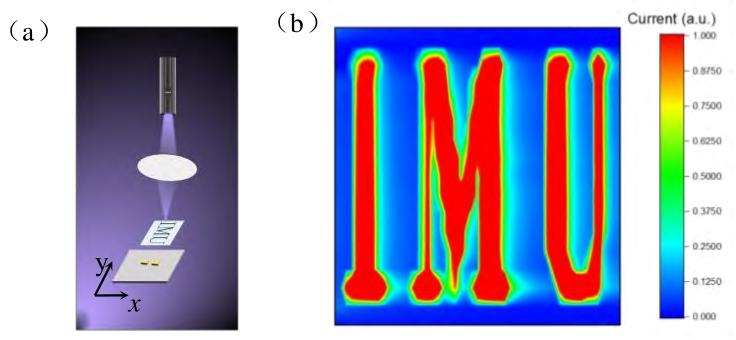图6. 日盲光电传感器成像:(a) 示意图;(b) 成像系统获得的实物图像