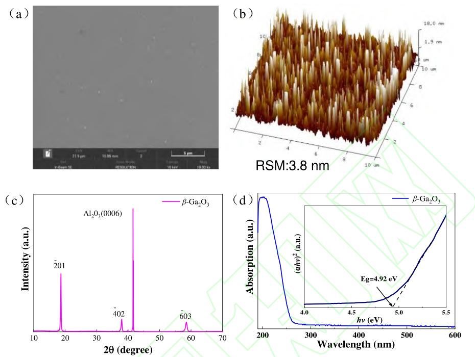 图1. β-Ga₂O₃ 薄膜物性:(a) 表面 SEM 照片;(b) AFM 图;(c) XRD 图谱;(d) 紫外-可见光吸收光谱,内插图为 Tauc 曲线图