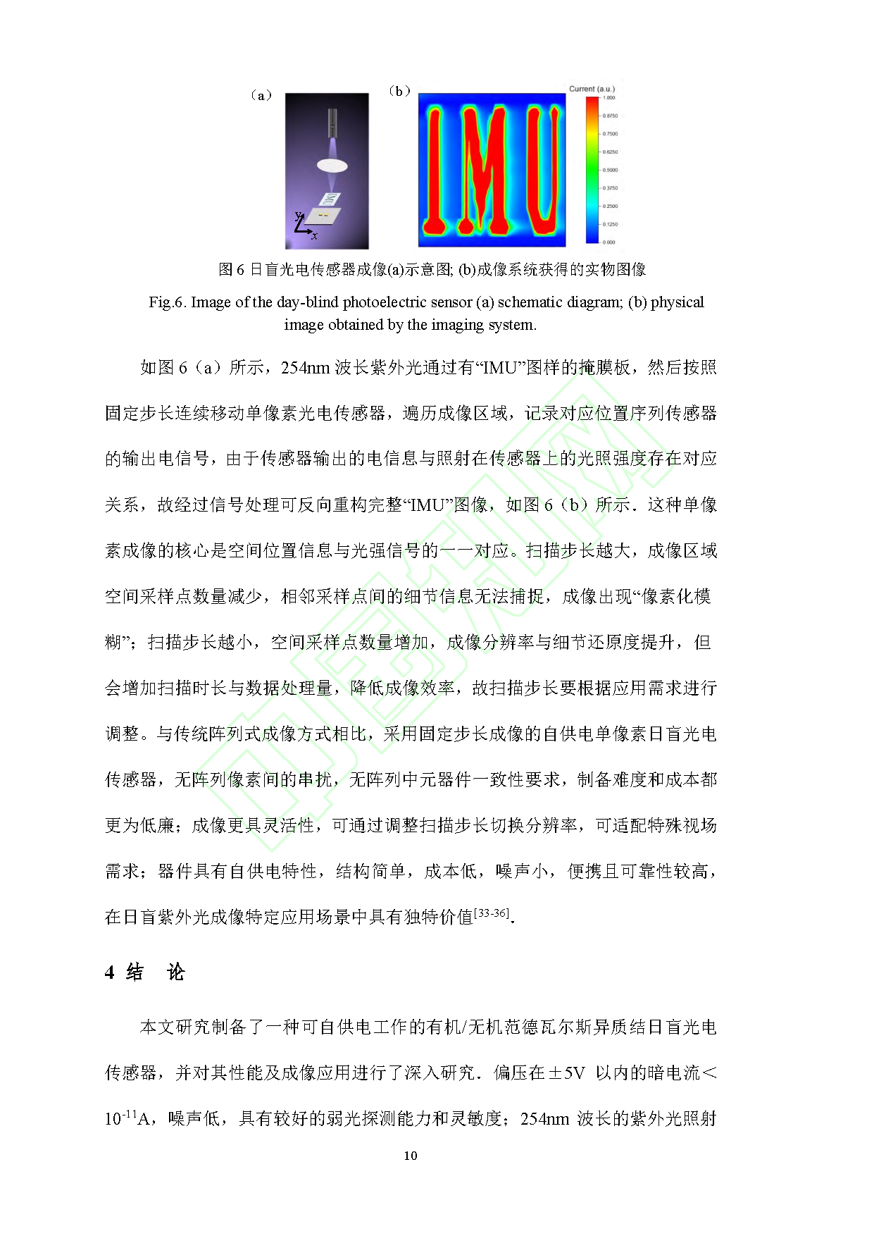 日盲紫外光探测在导弹追踪、紫外光通信、生物医疗等领域具有重要潜在应用价值,研发自供电型光电传感器可解决传统器件依赖外部偏压、能耗高的瓶颈。该团队采用等离子体增强化学气相沉积(PECVD)制备 β-Ga₂O₃ 薄膜,在其表面旋涂 PEDOT:PSS 构建有机-无机异质结光电探测器,研究其光电性能与单像素成像应用潜力。结果显示,零偏压下,经 47 μW/cm² 的 254 nm 日盲紫外光照射,器件光暗电流比达 8.8×10³,光响应度为 0.106 A/W,外量子效率为 38%,光电流随光照强度呈近线性变化,具备优异光响应性能。该探测器通过固定步长逐点扫描、信号采集、数据处理与图像重构,成功再现“IMU”字母图像,展现出单像素日盲光学成像的应用前景。
