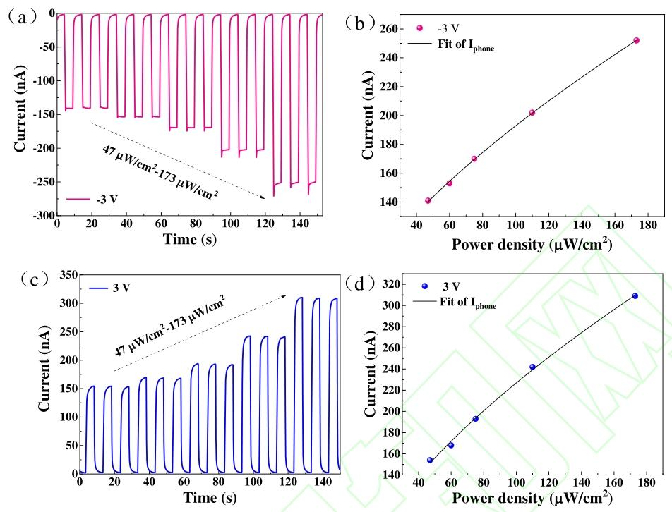 图4. 不同光照条件下:(a) 偏压为 -3 V 的 I-t 特性曲线;(b) 偏压为 -3 V 时,电流随光照强度的变化曲线;(c) 偏压为 3 V 的 I-t 特性曲线;(d) 偏压为 3 V 时,电流随光照强度变化曲线