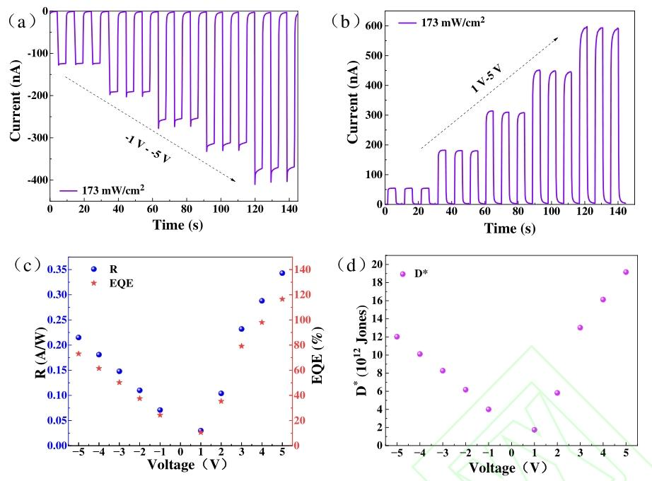 图5. 光照为 173 μW/cm²:(a) 不同负偏压下的 I-t 特性曲线;(b) 不同正偏压下的 I-t 特性曲线;(c) 不同偏压下的响应度和外量子效率;(d) 不同偏压下的归一化探测度