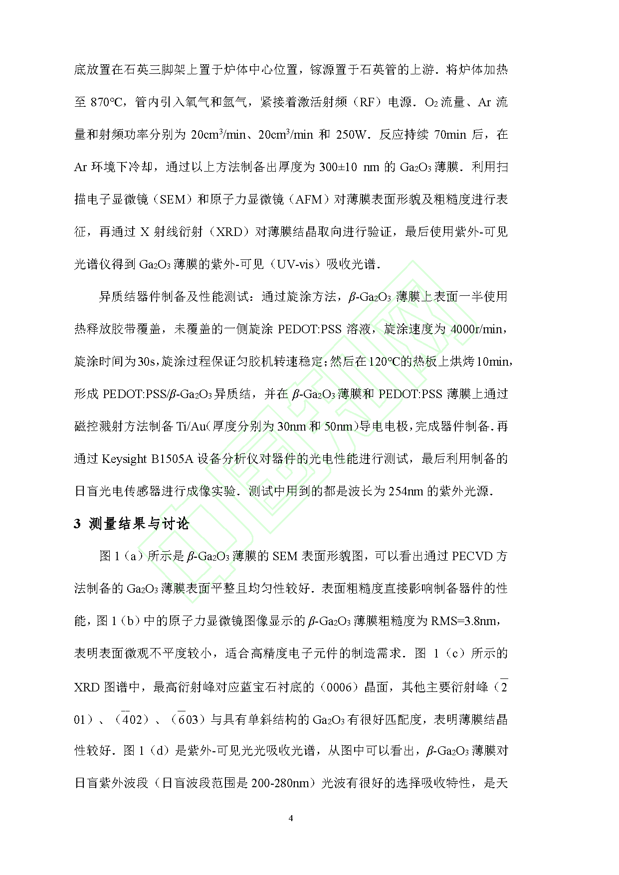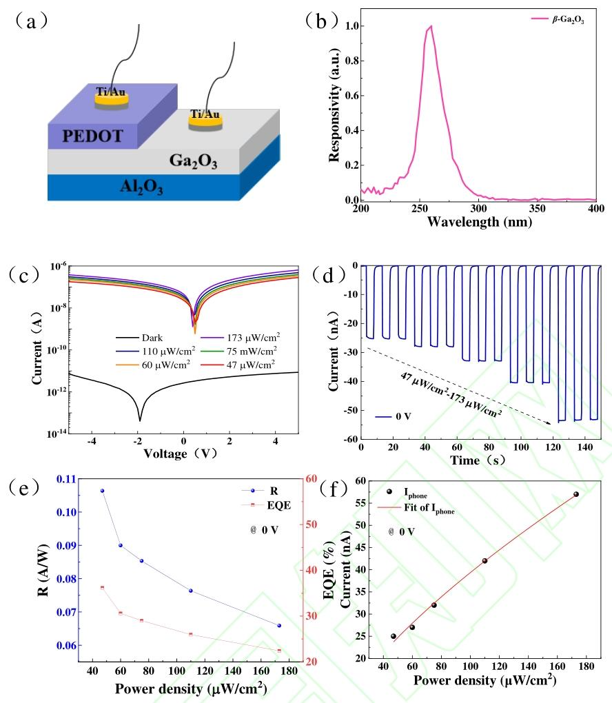 日盲紫外光电探测器工作于 200–280 nm 日盲紫外波段,受大气层对该波段光的阻挡作用,具备抗干扰、高精准的探测能力,是军事、航空、环境监测、电力设备局部放电检测、民用火灾预警等领域的核心器件。半导体禁带宽度决定光响应波长区间,超宽禁带半导体 β-Ga₂O₃(氧化镓)禁带宽度为 4.4–5.2 eV,是天然的日盲光探测材料,还兼具高临界击穿场强、化学与热稳定性优异、抗辐射抗氧化、制备成本低等优势。单一 Ga₂O₃ 材料存在探测功能局限,构建异质结可通过界面载流子非平衡扩散形成内建电场,实现无外部偏压的自供电探测,解决传统器件依赖外部电源、能耗高的瓶颈,适配安防、深空探测、便携可穿戴设备等场景。传统阵列式日盲成像器件对元器件性能一致性要求高、成本高,单像素成像仅靠单个像素结合扫描与数据处理实现成像,无像素串扰、分辨率可调、成本更低。该团队结合 β-Ga₂O₃ 与 P 型导电聚合物 PEDOT:PSS(聚 3,4-乙烯二氧噻吩/聚苯乙烯磺酸盐),构建有机-无机异质结,探究其自供电日盲探测与单像素成像性能。