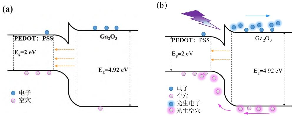 图3. PEDOT:PSS/β-Ga₂O₃ 异质结能带示意图:(a) 无光照;(b) 254 nm 光照