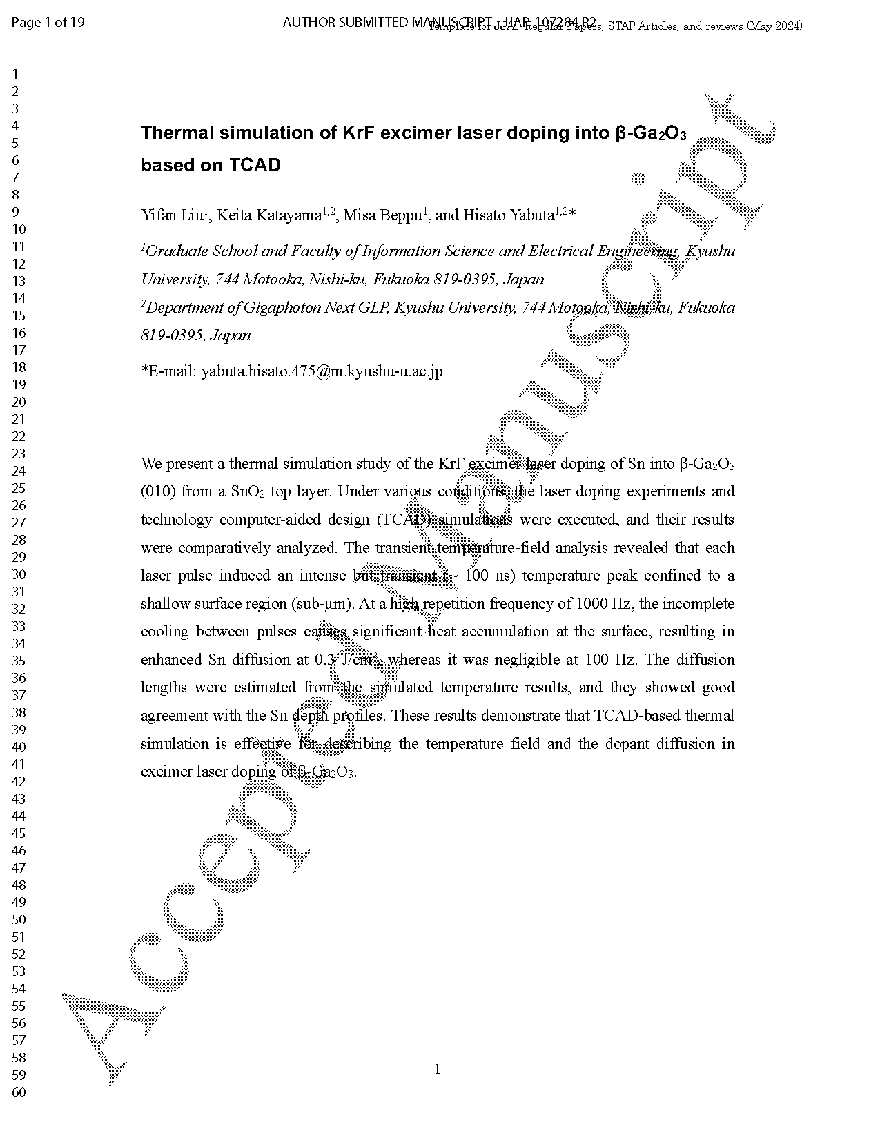 【国际论文】日本九州大学:基于TCAD的KrF准分子激光掺杂β-Ga₂O₃热仿真